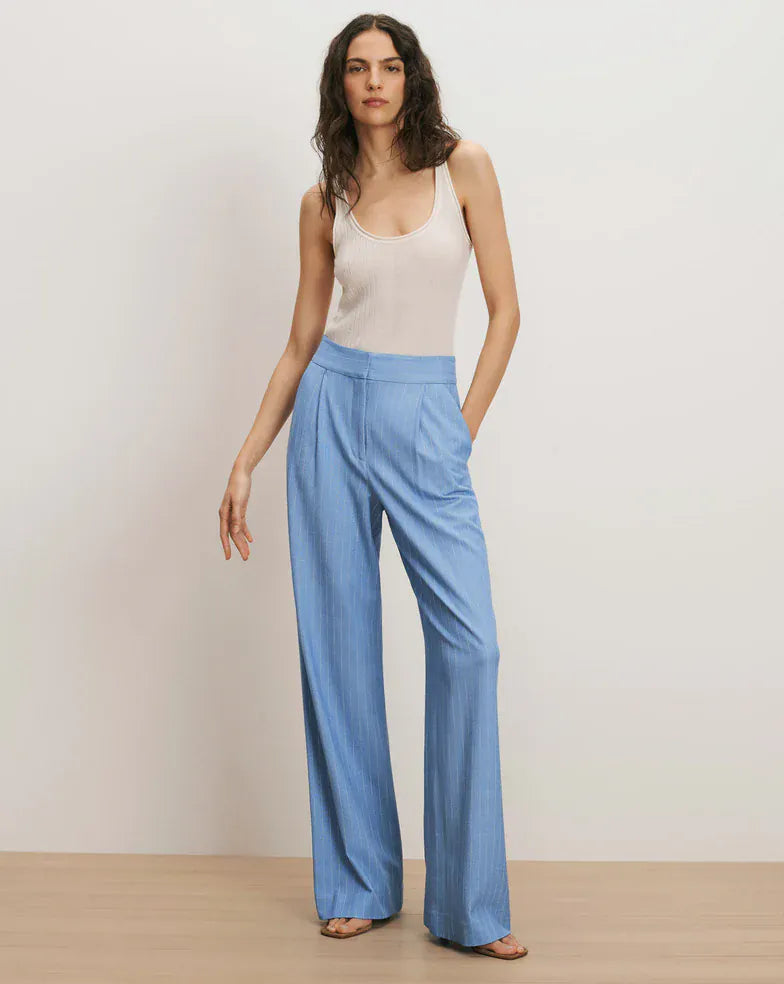 Un pantalon ample et décontracté, à la fois élégant et raffiné. Confectionné avec soin dans un tissu de costume, le Heyser Wide Leg Pant de VERONICA BEARD présente une viscose stretch mi-lourde à la texture légèrement flammée et au fini légèrement brillant. Dans un bleu à fines rayures, il possède une taille haute et une coupe large qui épouse délicatement les cuisses. Ses plis sur le devant assurent une grande liberté de mouvement. Doté d'une ceinture épurée, de poches latérales et de poches passepoilées à l'arrière, il se marie parfaitement avec un simple débardeur, un pull ou encore son Miller Pinstripe Dickey Jacket assorti pour un tailleur plus structuré.