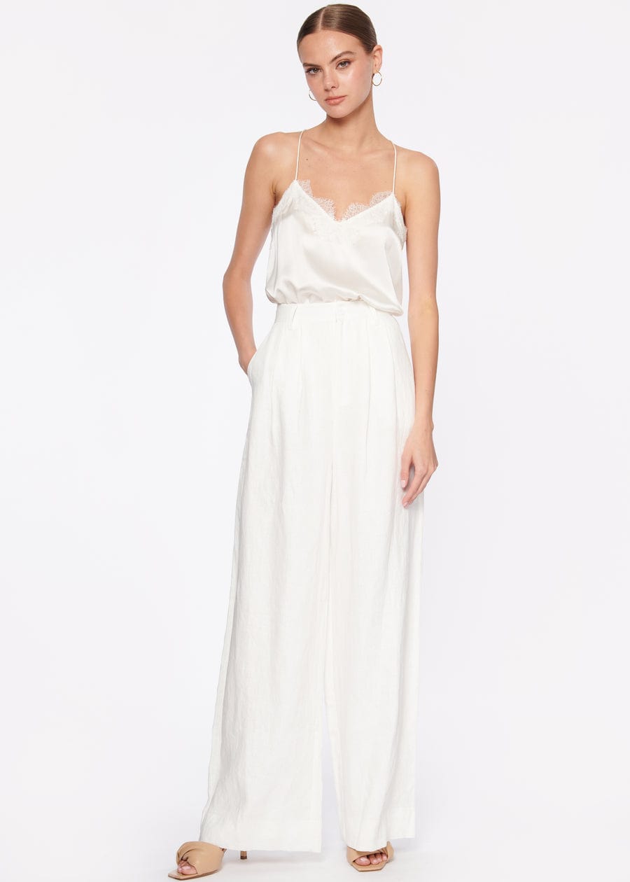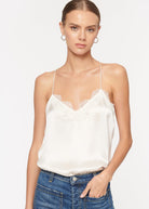 La camisole Racer préférée de la marque est confectionnée dans une charmeuse de soie délavée au sable et présente une encolure en V avec une bordure en dentelle française délicate et féminine. Ce style camisole léger a un dos nageur et un corsage ajusté décontracté. Parfaite de jour comme de nuit, elle sera un classique toute l'année.