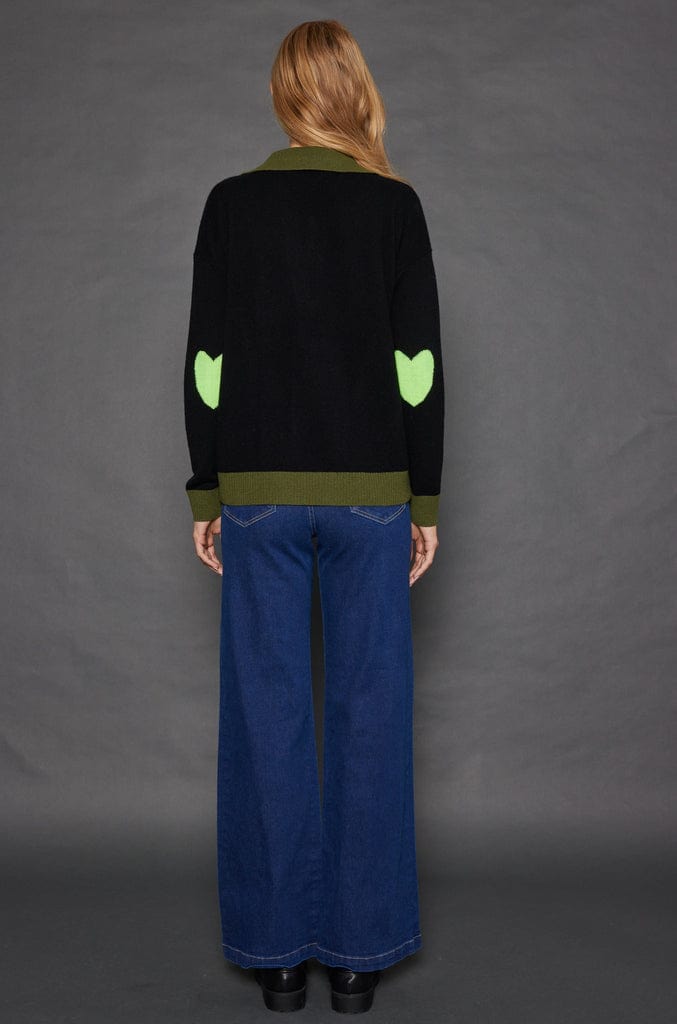 - Intarsia contrasté en forme de cœur sur les coudes.