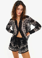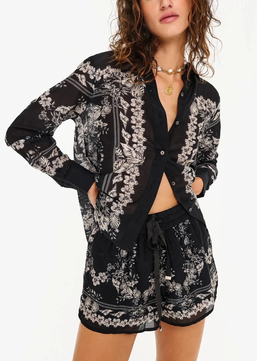 Cette chemise Rafella de CAMI NYC est une blouse boutonnée transparente à manches longues en coton et soie. Pouvant passer d'une tenue de journée à un look de soirée, elle sera aussi belle agencée avec un short, un pantalon propre ou un jean.