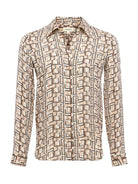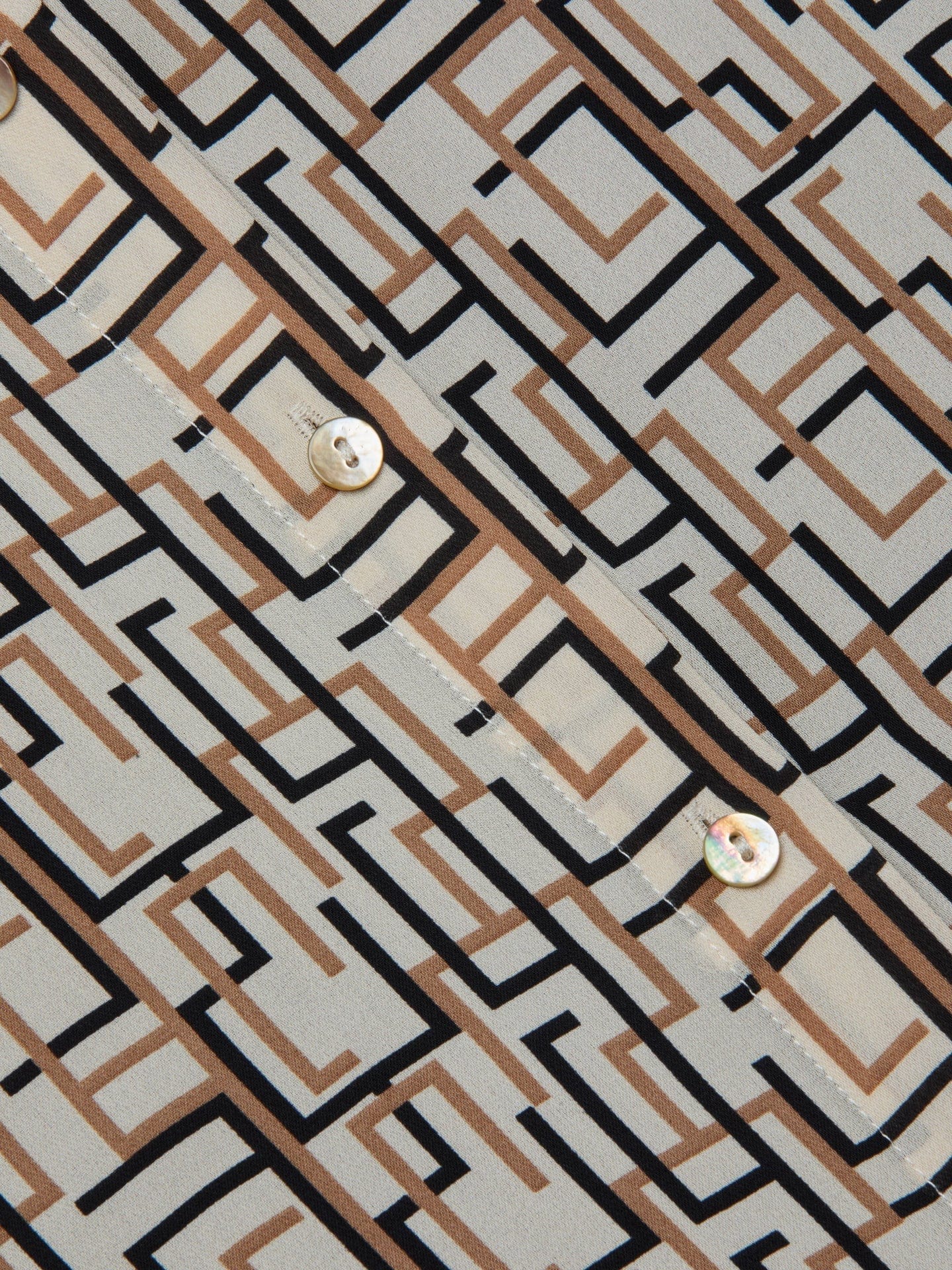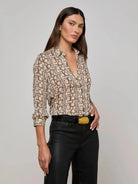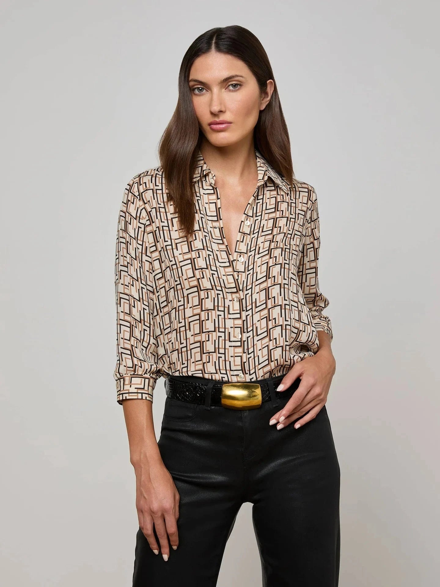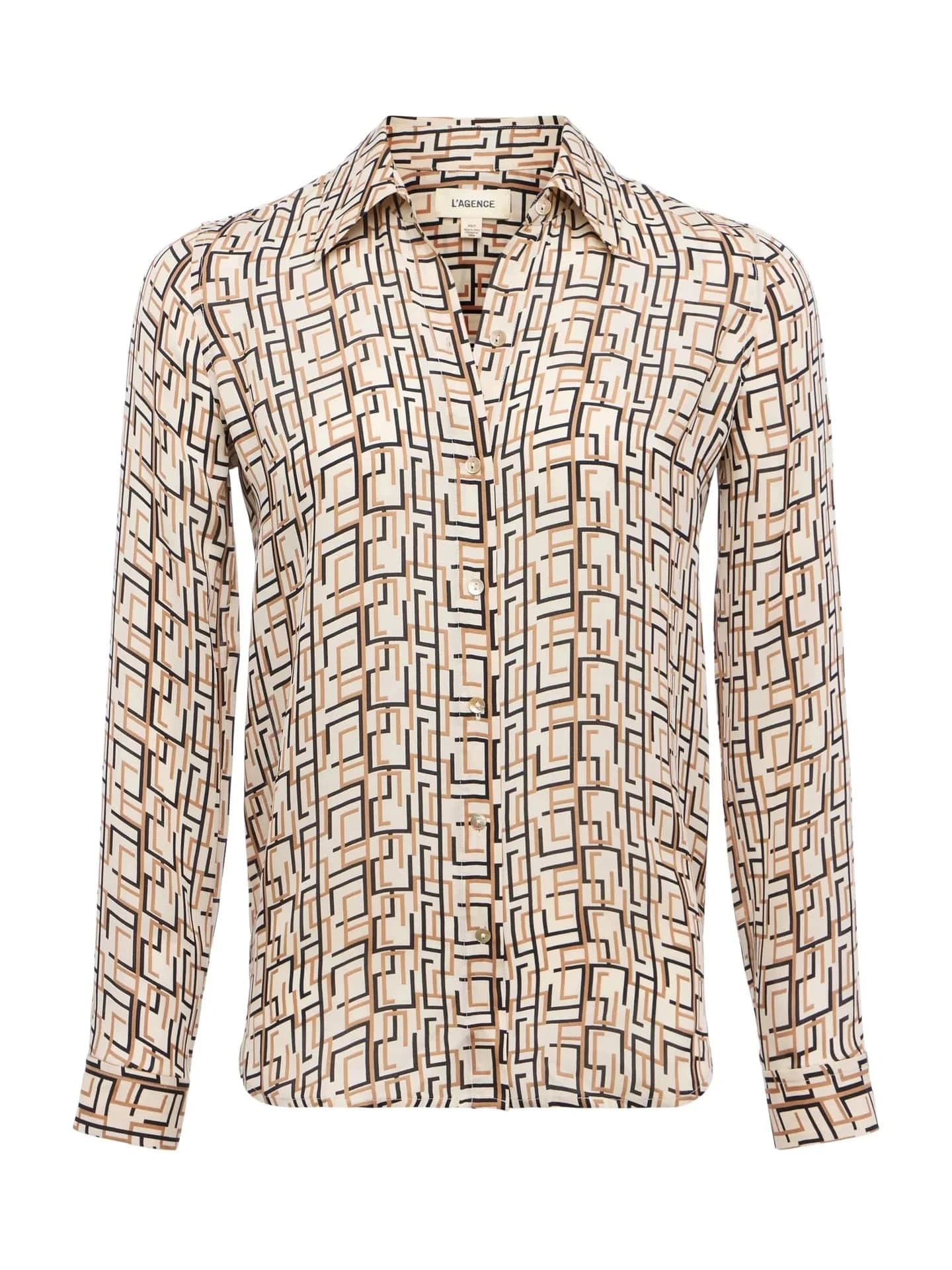 L'incontournable chemisier en soie Nina de L'AGENCE à la coupe décontractée se décline dans un magnifique imprimé géométrique au charme vintage. Portez-le avec un jean de jour ou avec un pantalon propre pour une occasion spéciale.