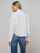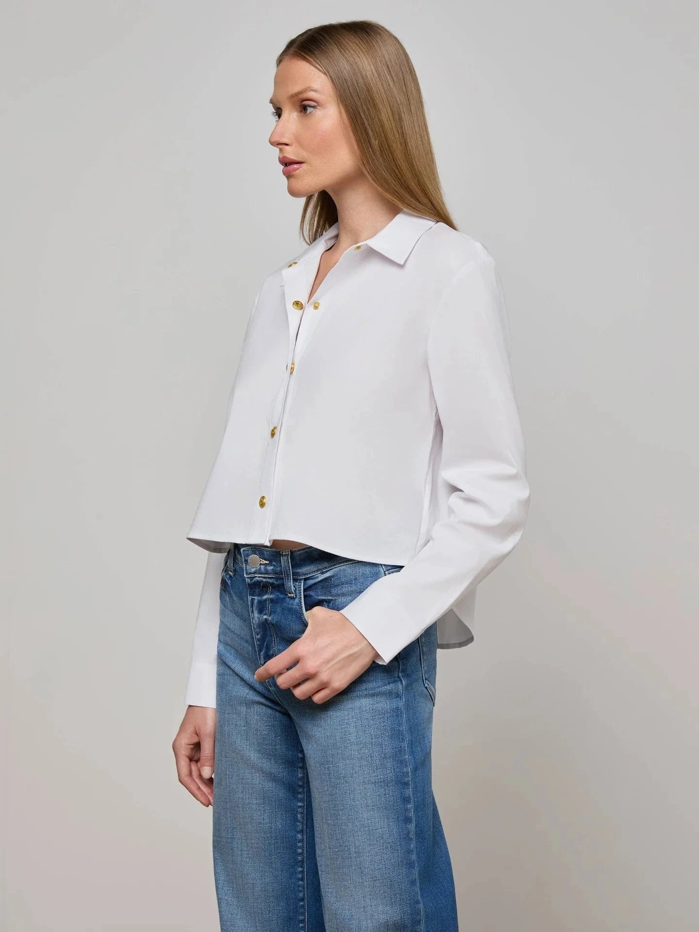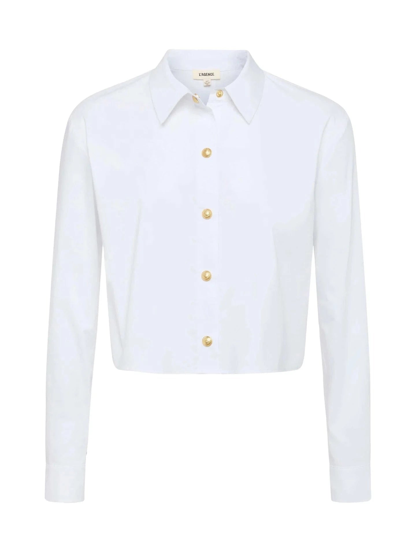Désormais disponible en blanc et or, la chemise Cosette de L'AGENCE est une chemise classique avec une coupe décontractée, inspirée des modèles masculins. Elle présente des boutons bombés miniatures en relief pour une touche glamour. Confectionnée en popeline de coton biologique, elle est aussi stylée que responsable.