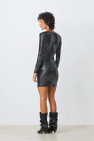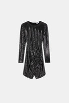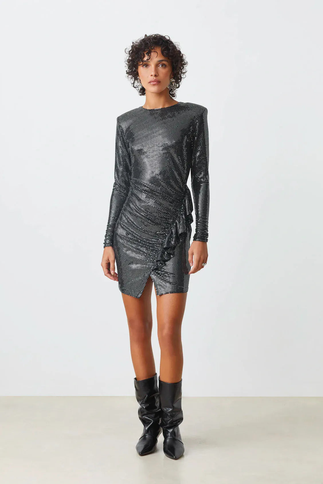 La robe courte Coco en jersey à facette de SUNCOO présente des fronces et volants féminins qui découpent la silhouette. Parfaite pour être agencée à des bottes hautes, sa brillance en fait la robe idéale pour les fêtes.