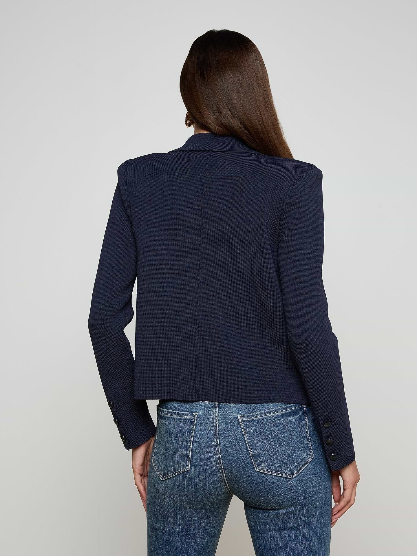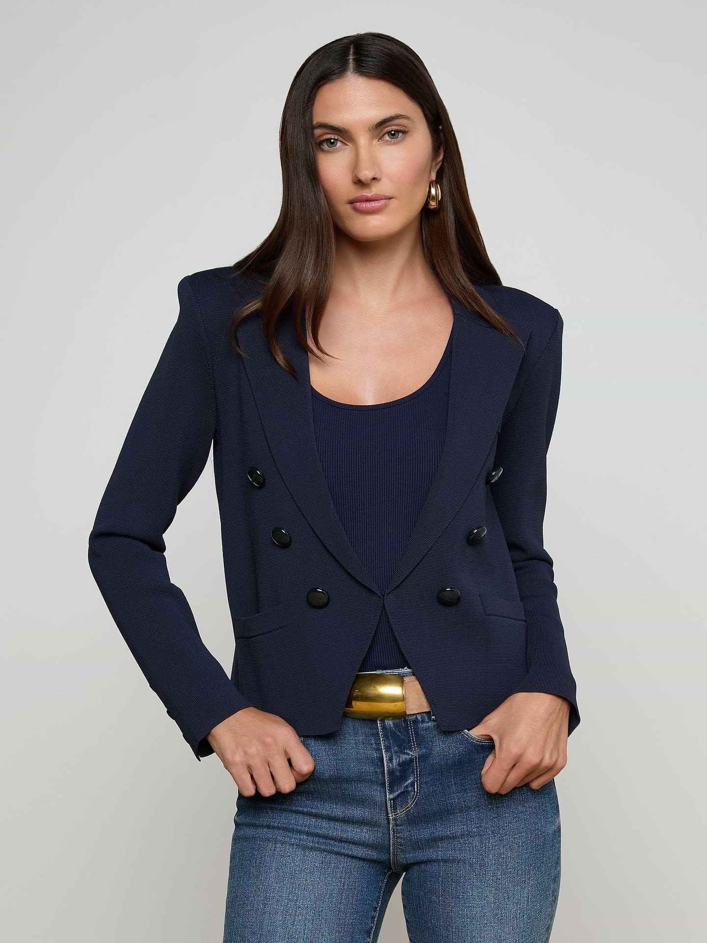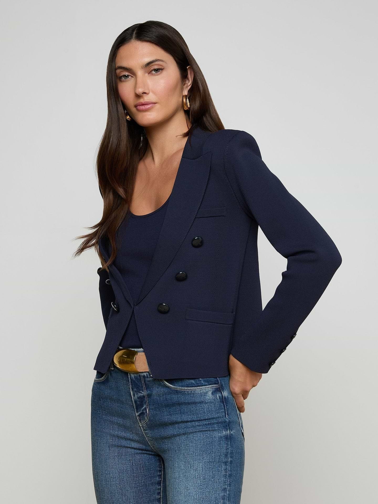 Le blazer en maille Mercer de L'AGENCE incarne à la perfection l'élégance décontractée avec sa coupe croisée et sa fermeture à agrafe. Aussi facile à enfiler qu'un cardigan, il offre une silhouette impeccable. Complétez votre look en le portant sur un body et un jean.