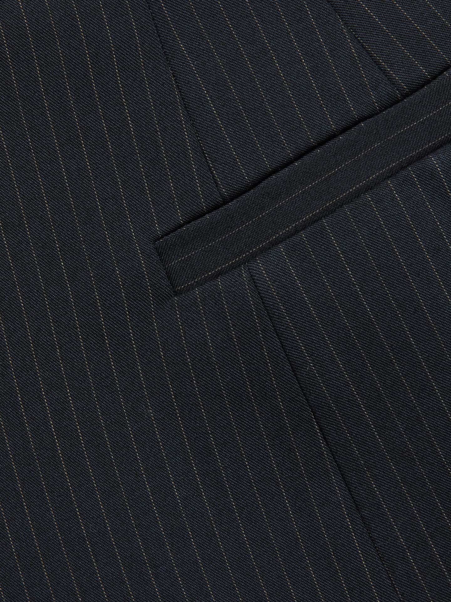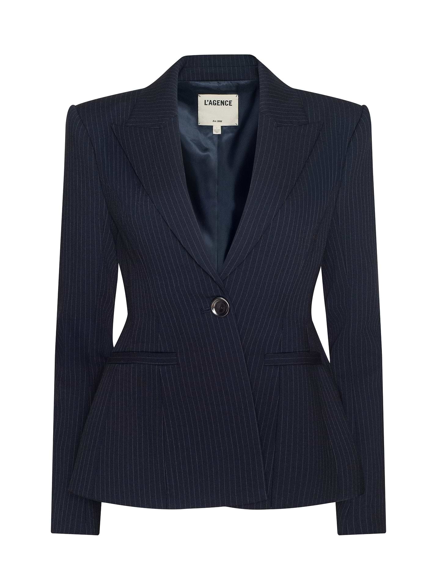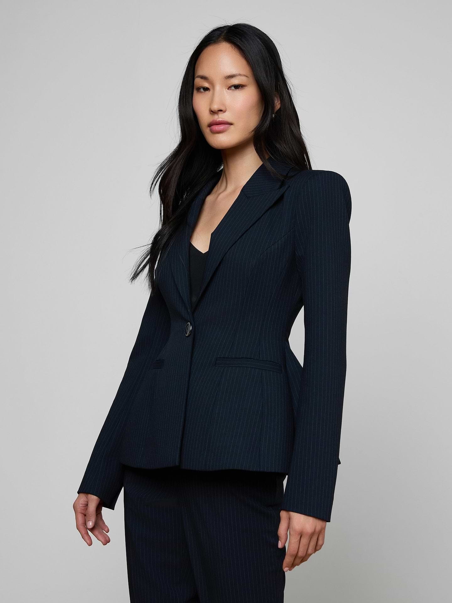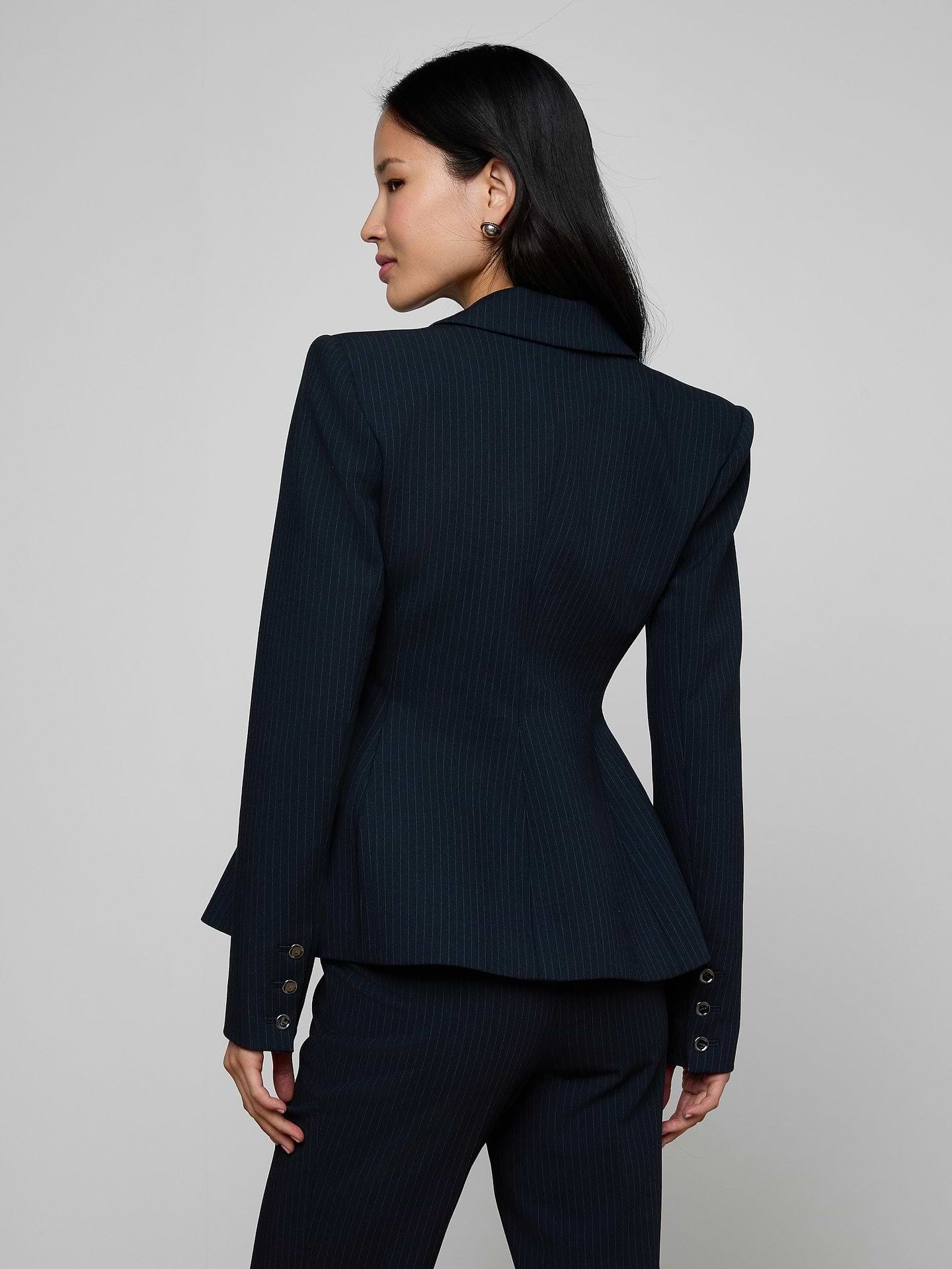 Présenté pour la première fois lors de leur défilé Printemps 2026 à la Fashion Week de New York, le blazer Therese, sculptural et saisissant de L'AGENCE, joue sur les contrastes de formes. Une taille cintrée équilibre un ourlet péplum spectaculaire, tandis que de fines rayures bleu marine classiques harmonisent l'ensemble. Portez-le avec le pantalon Rebel Pinstriped pour une tenue tailleur qui a du punch.