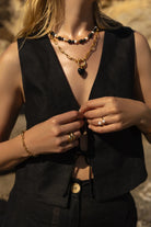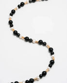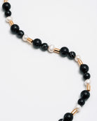 Découvrez le collier Viola de Mademoiselle Jules. Ce modèle présente des perles noires et nacrées avec tige dorée. Portez-le seul ou en superposition.