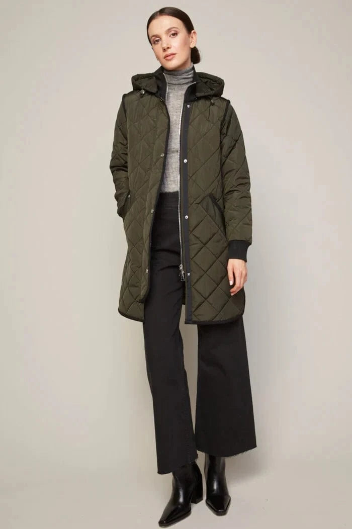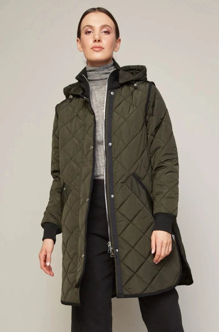 Le Libby d'ADROIT ATELIER est un manteau matelassé de silhouette « A », avec des épaules étroites et coupe plus ample aux hanches. Il possède un matelassé en losange, un col montant et des poignets côtelés, puis une fermeture éclair dissimulée. Un détail ruban sergé sur le devant, les poches, les épaules, les manches et le dos, ainsi qu'un détail gros-grain sur la fermeture éclair, complètent ce manteau polyvalent. Sortez avec un peu de flare en dézippant les fentes latérales.