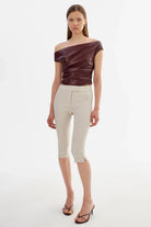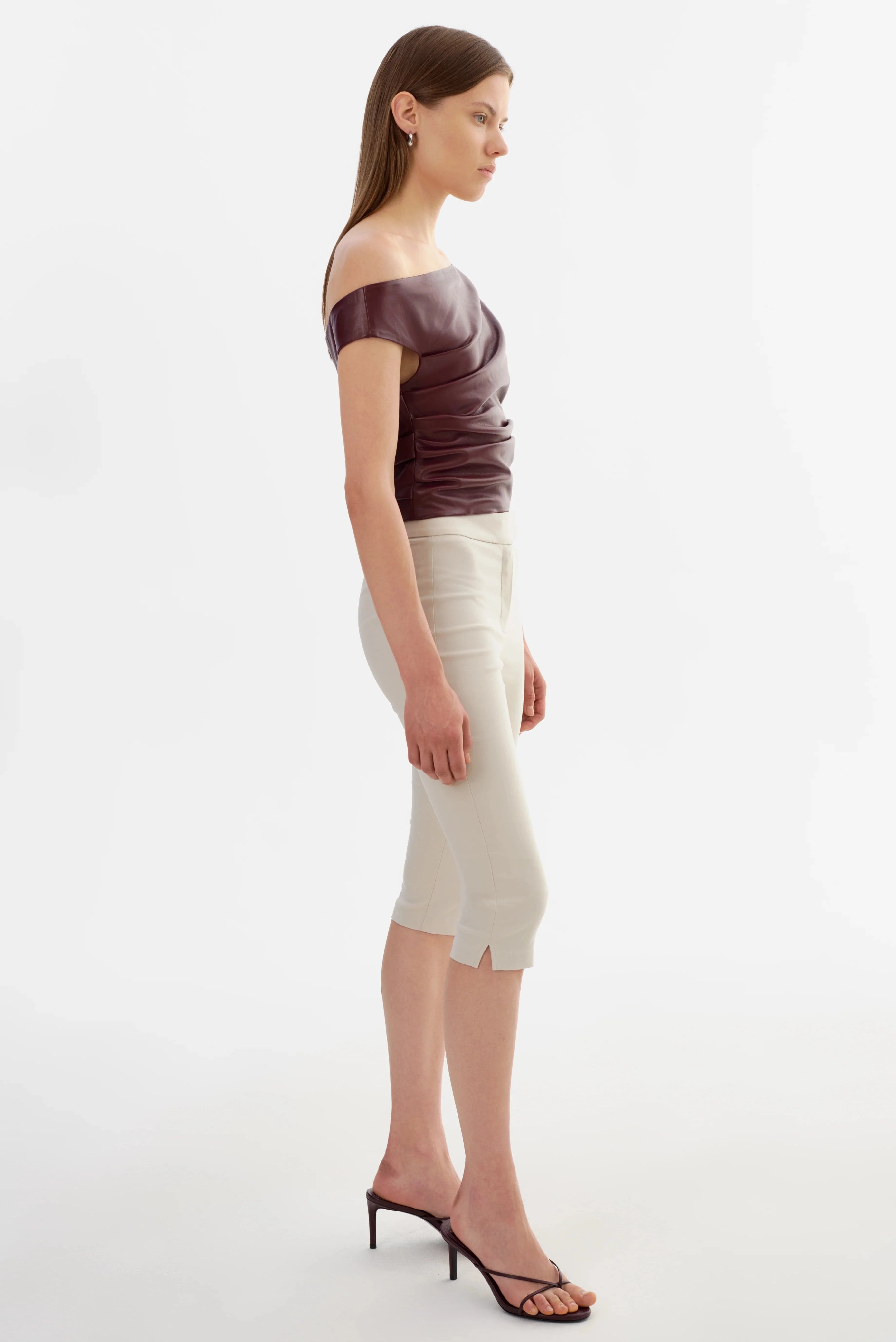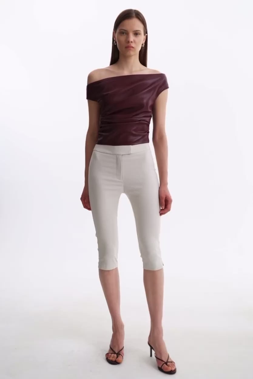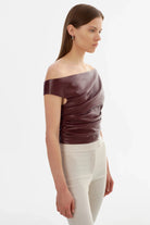 Le haut Ines en similicuir de LAMARQUE incarne une sophistication moderne. Confectionné en faux cuir souple avec une encolure asymétrique dévoilant une épaule, il présente de subtiles fronces sur le corsage pour un effet sculptant et flatteur. À la fois élégant et résolument contemporain, ce modèle apporte une touche de raffinement à toutes vos tenues.