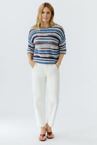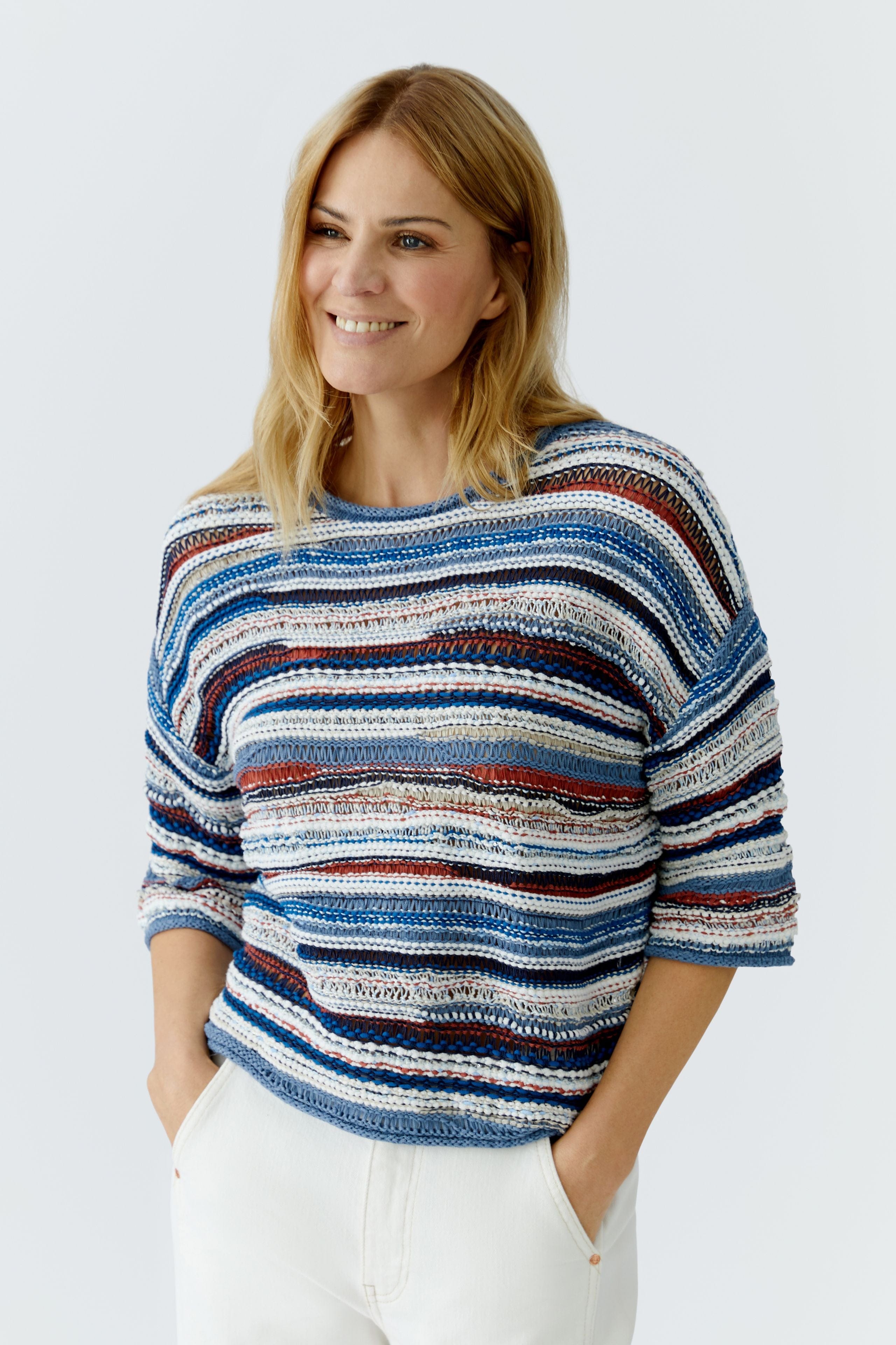 Ce pull en maille mixte de OUI FASHION présente des rayures irrégulières à la structure 3D. Tricoté avec un point perlé et des micro-paillettes pour une brillance subtile, ce tricot ira parfaitement avec un jean blanc pour une tenue printanière.