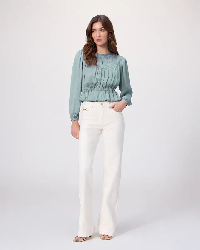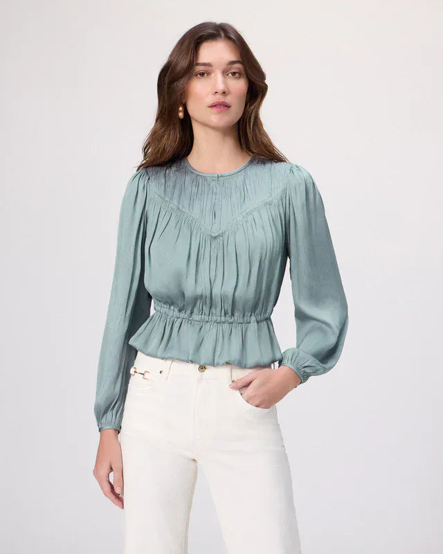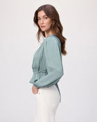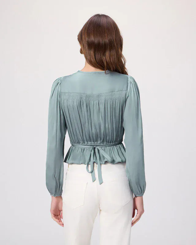 Le haut Gansevoort de PAIGE est confectionné en satin mat écologique dans un doux bleu turquoise. Doté de manches longues et de détails élastiques, ce modèle féminin présente une coupe flatteuse avec un ourlet péplum, des smocks en V sur le devant et le dos, ainsi qu'une ceinture à nouer à la taille. Portez ce haut avec votre jean préféré.