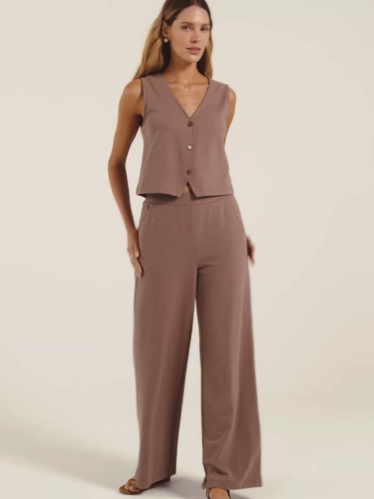 Confectionné dans une maille texturée douce, le confort est primordial avec cet ensemble Noelle & Andre de Z SUPPLY. Pièce classique et polyvalente, le gilet Noelle est doté d'une fermeture boutonnée sur le devant et d'un col en V. Le pantalon à jambes larges Andre présente une taille élastique, une coupe taille haute et des poches latérales. Offrant une grande liberté de mouvement, cet ensemble léger sera un incontournable de votre garde-robe.