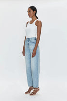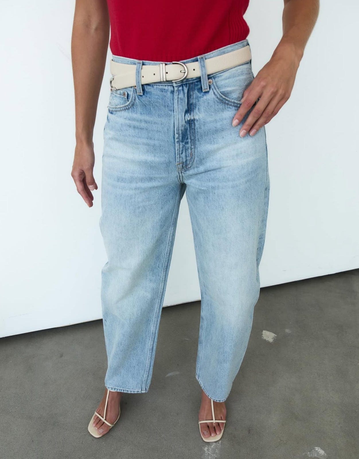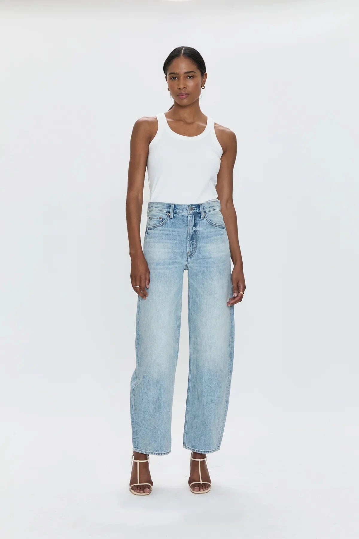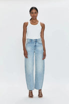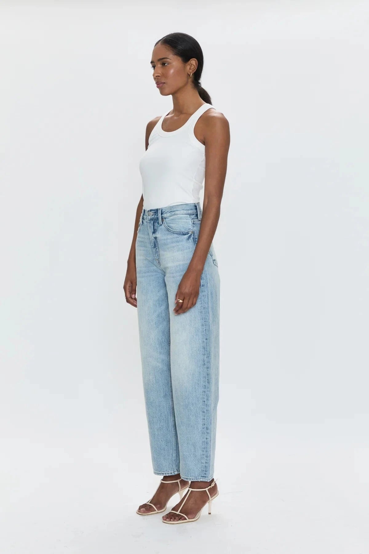 Ce jean Wes de Pistola présente une taille haute avec un entrejambe pleine longueur de 30" et une silhouette de jambe cylindrique. Fabriqué à partir de denim rigide non extensible pour une coupe experte, il conserve sa forme, avec des finitions d'ourlet épurées. Sa couleur Clever est un délavage clair d'inspiration vintage avec une décoloration modérée.