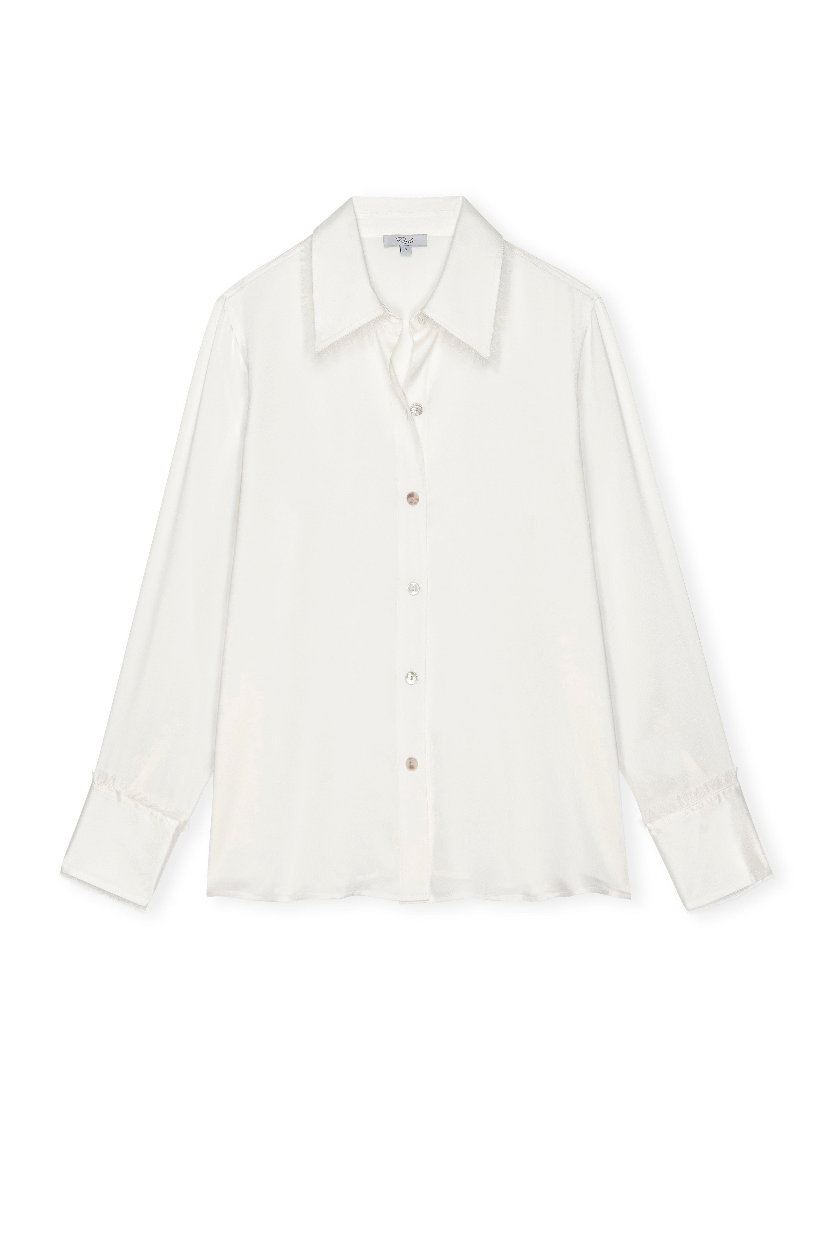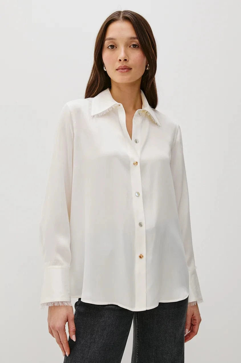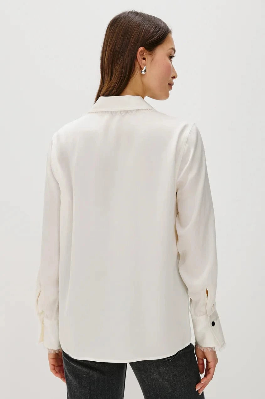 L'Abbey de Rails est une chemise boutonnée en charmeuse de soie, ornée de bords francs au col et aux poignets. Elle offre une coupe facile et une touche de féminité. Enfilez-la dans votre jean préféré et le tour est joué.