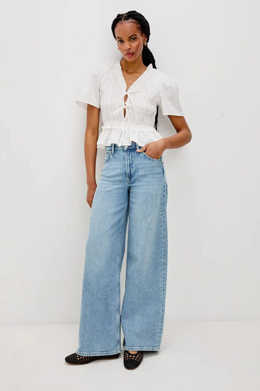 Le haut Portia de Rails est un haut péplum structuré en popeline de coton épaisse. Des liens à nouer sur le devant permettent d'ajuster le décolleté plongeant, tandis que de délicats volants complètent le look. Portez ce haut pour des occasions autant habillées que décontractées, avec votre paire de jeans ou de shorts préférés.