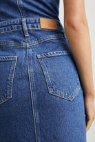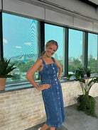 La robe Malibu de Rails est une robe midi avec un devant entièrement boutonné, des lignes de style rétro et des bretelles réglables. La couleur Mazarine est d'un lavis bleu moyen brillant.