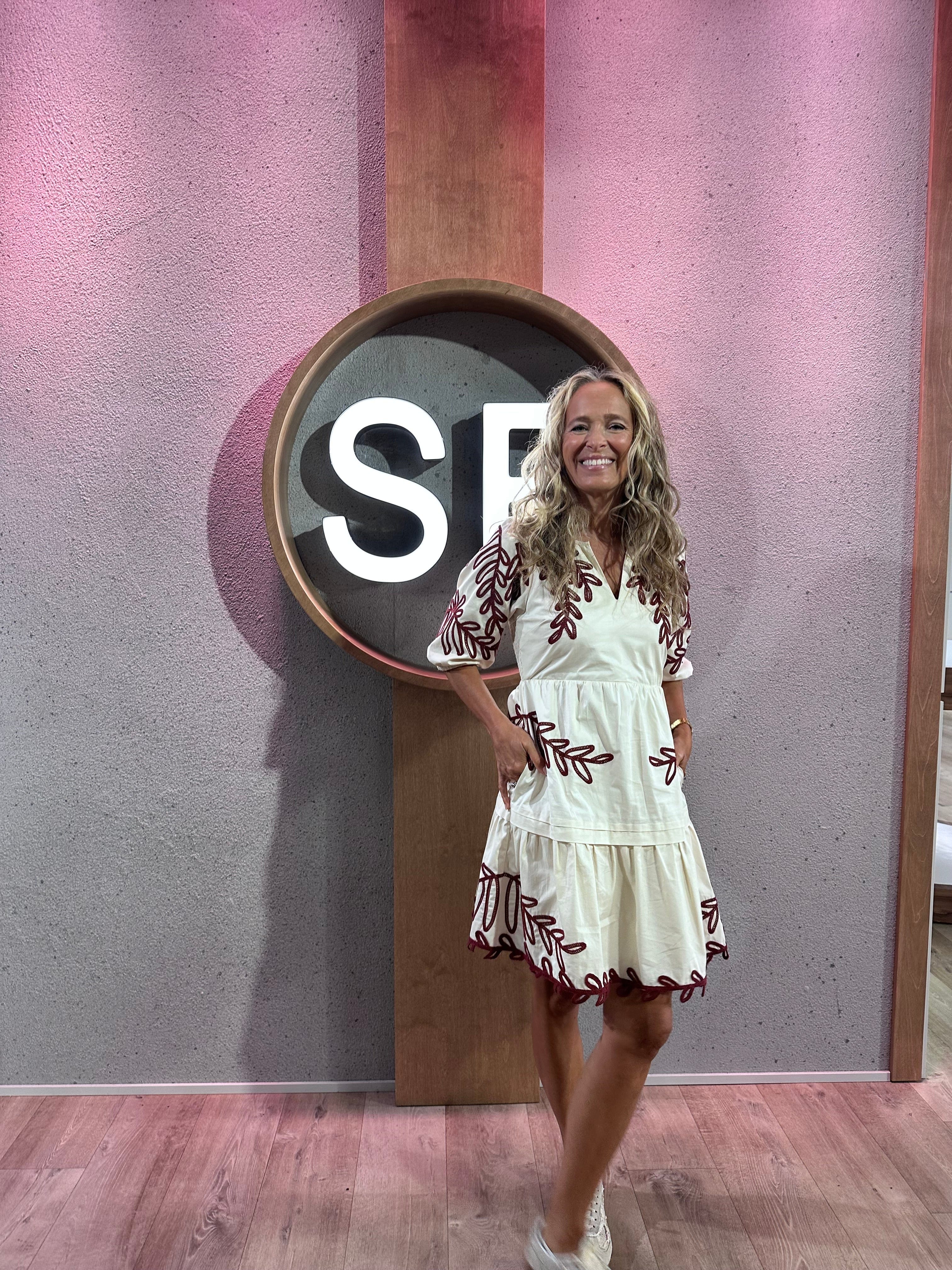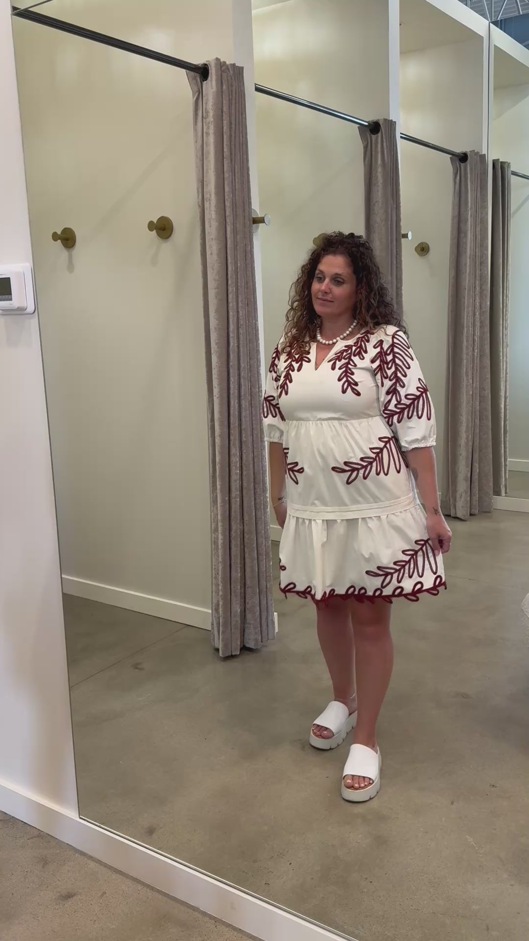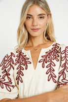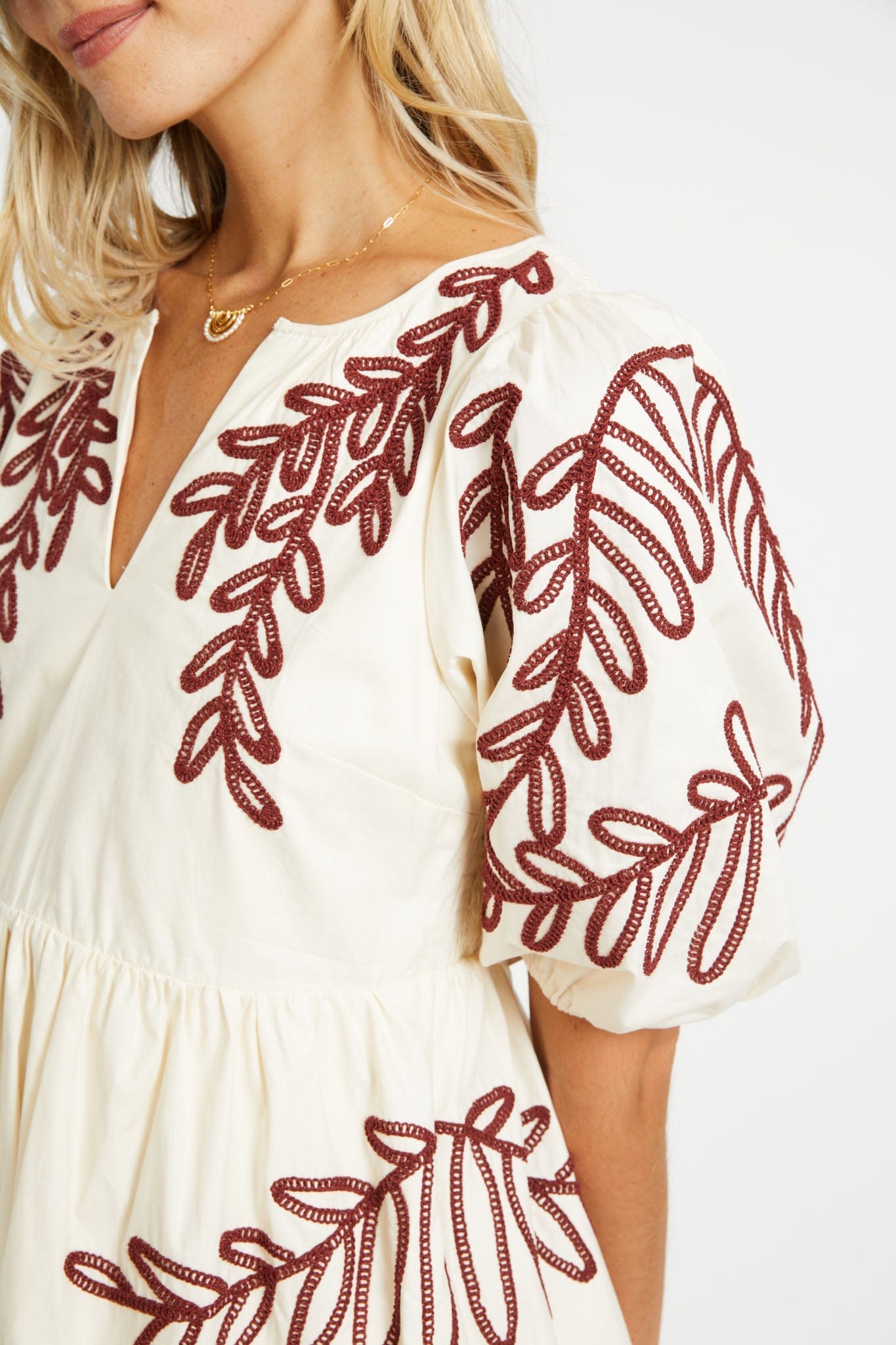 La robe Carrie de Caballero est confectionnée en sergé de coton ivoire doux, offrant une sensation de légèreté et un drapé naturel. Sa silhouette fluide à volants est ornée de magnifiques broderies de feuilles couleur chocolat, judicieusement placées le long de l'empiècement, des manches, de la taille et de l'ourlet pour un look riche et naturel. Des manches bouffantes séduisantes ajoutent une touche ludique, tandis qu'un dos smocké assure un ajustement confortable et souple. À la fois charmante et facile à porter, la robe Carrie allie détails romantiques et élégance décontractée, parfaite pour toutes les occasions.