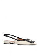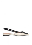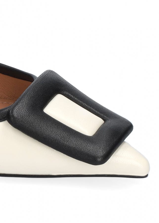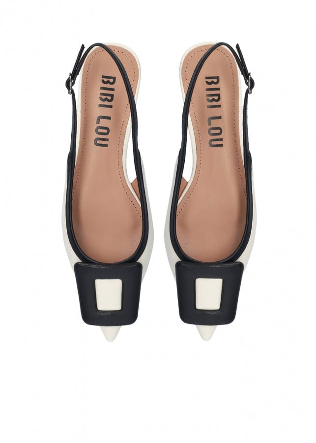 La ballerine Bonnie de Bibi Lou présente une ouverture en cuir blanc et fermeture à boucle noire à l'arrière. Avec son bout pointu plat, sa bordure carrée doublée et talon plat doublé de 2 cm, ce modèle est aussi fashion que confortable.