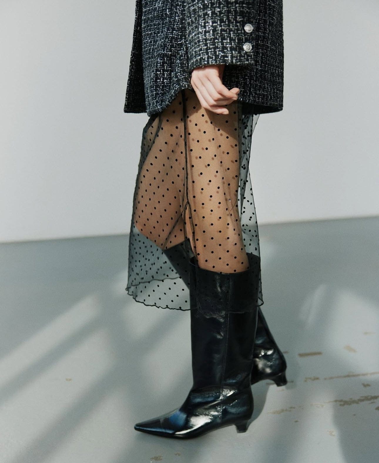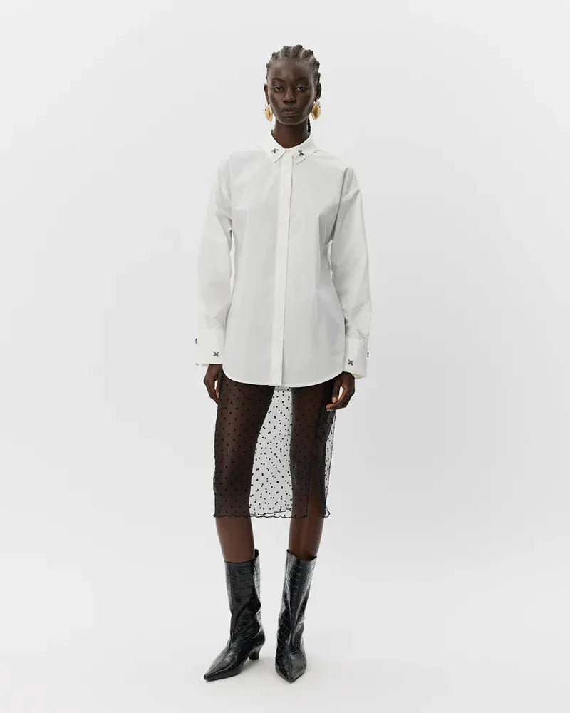 The Francessw skirt by SOFIE SCHNOOR has a slight trapeze cut, then midi length. Sheer, it features a black polka dot print and a comfortable elastic waistband. Match this model with a shirt or jacket for a sexy outfit with a touch of egde.