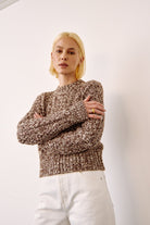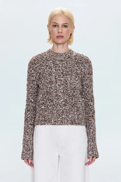 PISTOLA's Quinn sweater offers the classic charm of cable-knit with a shortened cut for a contemporary look, without a bulky effect. It combines traditional texture with modern proportions for a flattering silhouette without weighing you down. The Chocolate Marl color adds refined sophistication with a mottled brown hue that adds depth and relief. Crafted in a luxurious blend of cotton and wool, this sweater is both thick and comfortable for all-day wear.