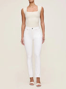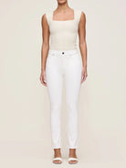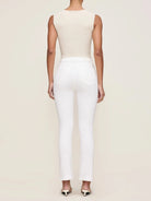 DL1961's Mara jeans are straight-cut, ankle-length mid-rise jeans that use Instasculpt technology to smooth, sculpt and contour the body for a perfect fit. It features faux front pockets, shiny silver finishes, tonal stitching, a clean hem and an ecru patch on the back. Its white color is a fresh, streamlined denim. Crafted in DL Airbrushed fabric, this model creates a smooth, sculpted effect by combining high-retention stretch technology with certified cotton that gives it an airbrushed look while retaining its suppleness. It will become your go-to jean for summer.