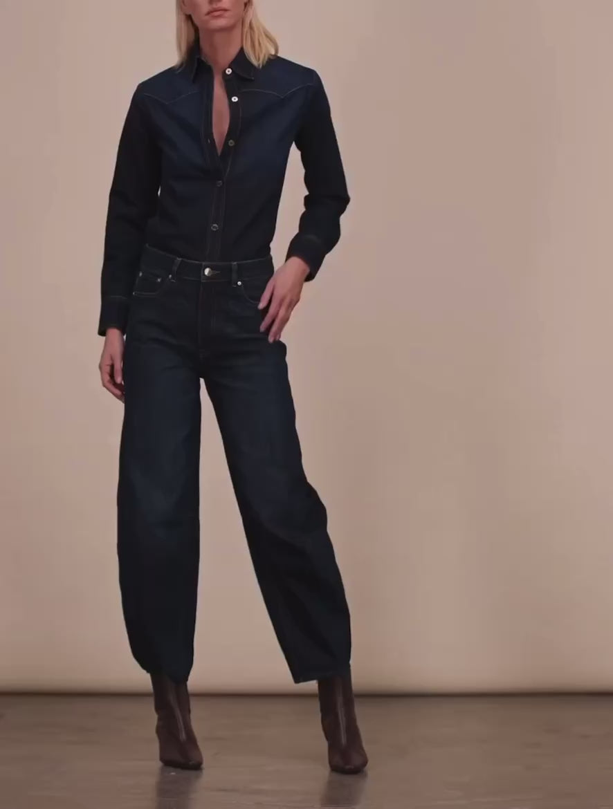 DL1961's Miro is a high-waisted, straight-cut jean with tapered leg, fitted at the hips, with a 28" inseam. In Ventura, a dark denim color, it features gold trim, khaki stitching, a clean hem and a black patch on the back. Crafted in DL Vintage fabric, it features stretchy, stiff and comfortable denim, woven with certified cotton for an authentic look and fit that's just like you. Match it with theInes shirt for a denim on denim outfit.