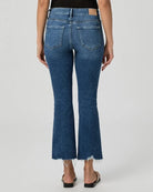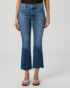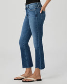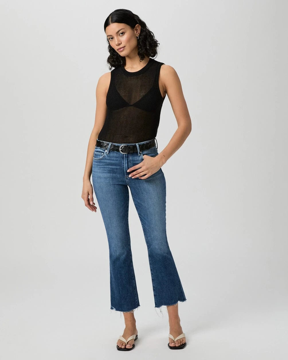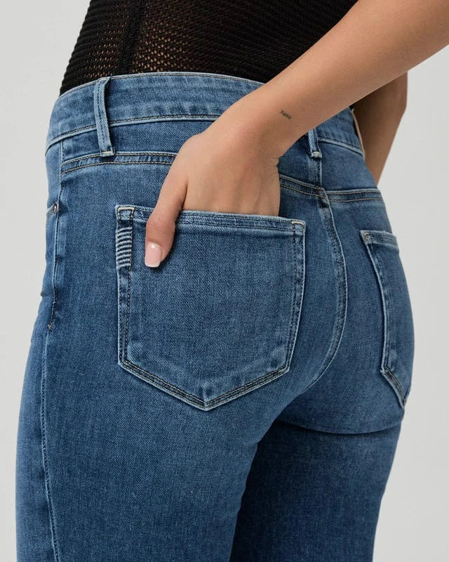Paige's Colette jeans feature a high waist. They're fitted at the hips and thighs, with a flared cut below the knee and a length above the ankle. Crafted from their TRANSCEND VINTAGE denim in a timeless dark wash, they feature worn-in details and a raw hem. These jeans have the look of authentic vintage denim, yet are incredibly comfortable thanks to their elasticity and good fit. Match them with your favorite pair of sandals for summer.