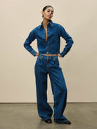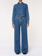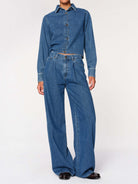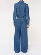 DL1961's Isabel is a vintage mid-low rise with a relaxed fit through the waist, tapering outward from the thigh for a wide leg with a 32" inseam. It features gold detailing, multicolored stitching, a sleek hem and an ecru patch on the back. Its lightweight denim wraps you in unparalleled comfort while retaining the appeal of classic denim. Its North Beach color is a blue denim with authentic character. Dress it up with its matching Montauk shirt.