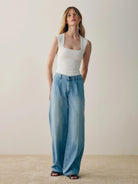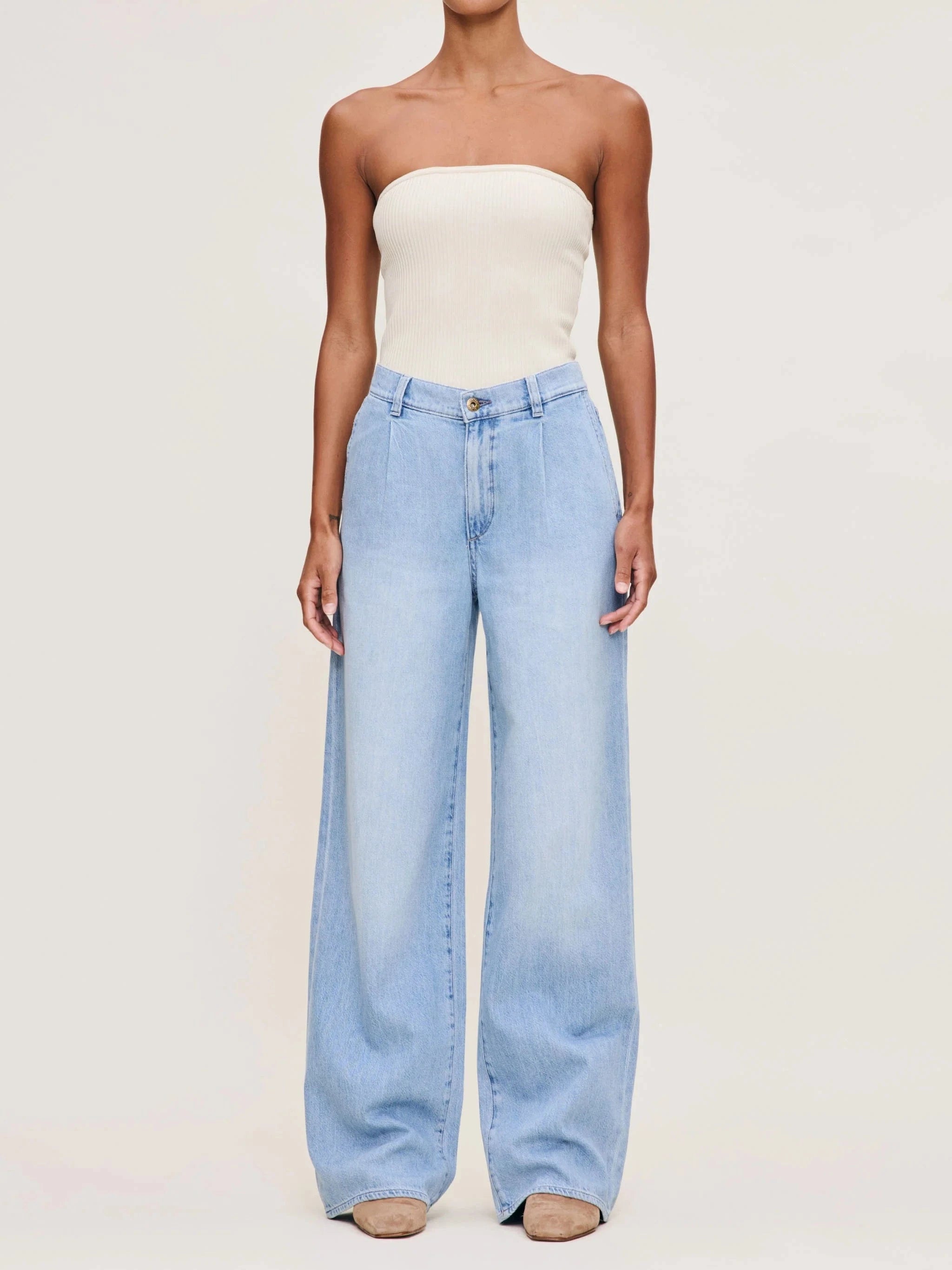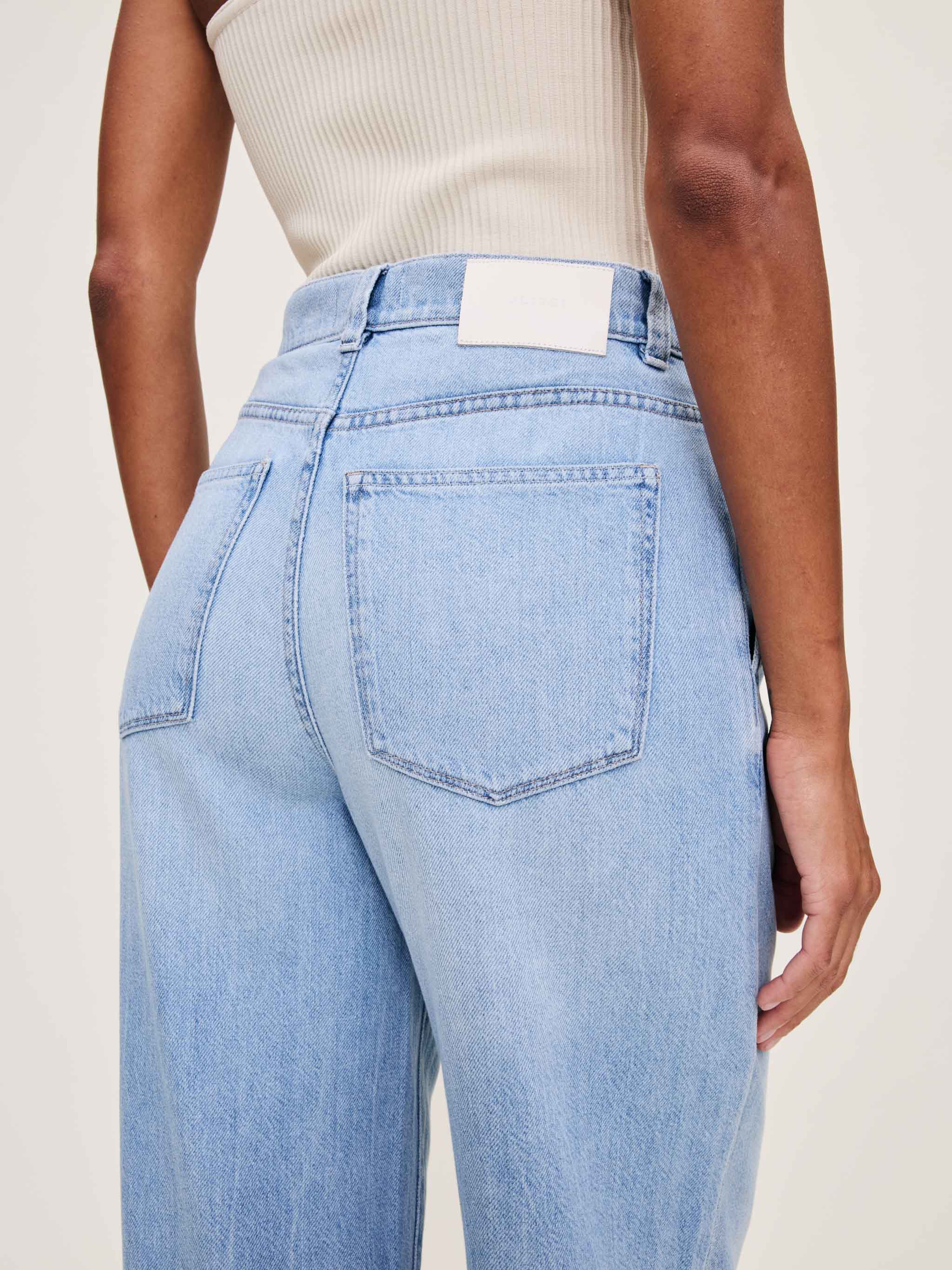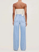 DL1961's Isabel jeans are a vintage low-rise with a relaxed fit through the waist and seat, tapering outward from the thigh for a wide leg with a 31.5" inseam. It features a silver upper, tonal stitching, a sleek hem and an ecru patch on the back. Its Beachfront color is a bright, light indigo wash with a vintage-inspired look. Part of the DL Aura collection, the Isabel jeans are made from a certified cotton blend with TENCEL™ Lyocell that redefines lightweight denim. They'll wrap you in unsurpassed comfort while retaining the appeal of classic denim. Pair these jeans with their matching Montauk shirt for a totally fashionable denim-on-denim look.