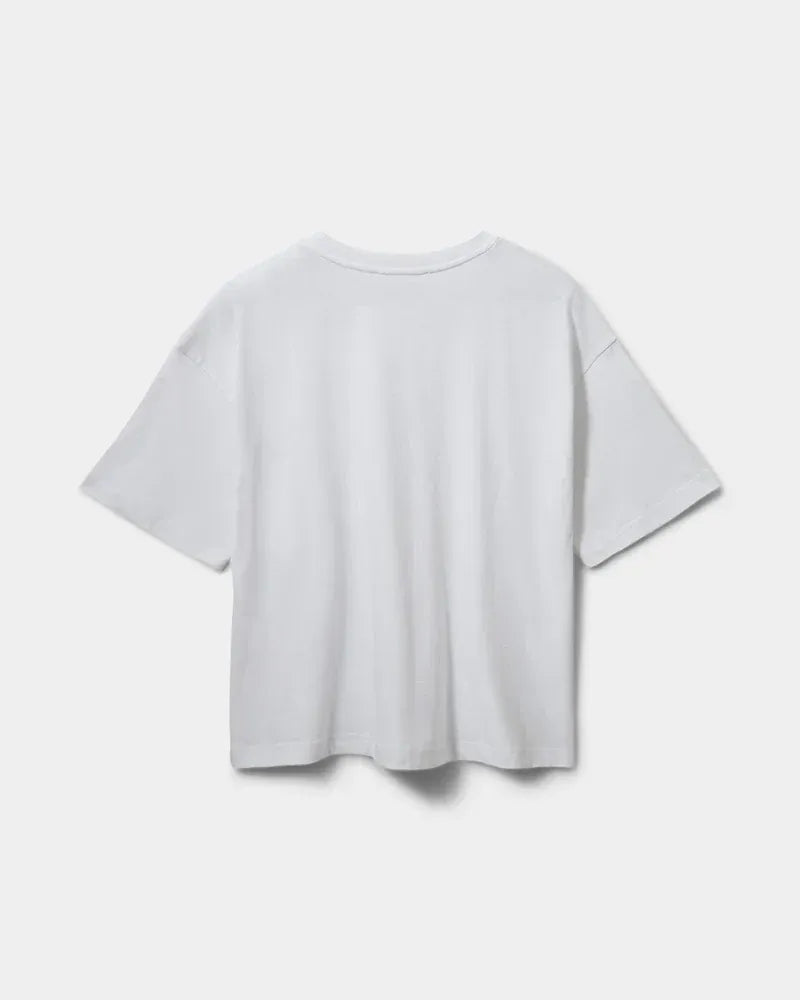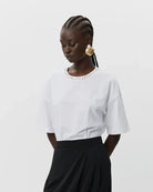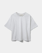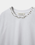 SOFIE SCHNOOR's Verasw loose-fitting t-shirt features a round neck adorned with white rhinestones in various sizes for a touch of whimsy. It can go from chic to casual, and can be worn with jeans or dress pants.