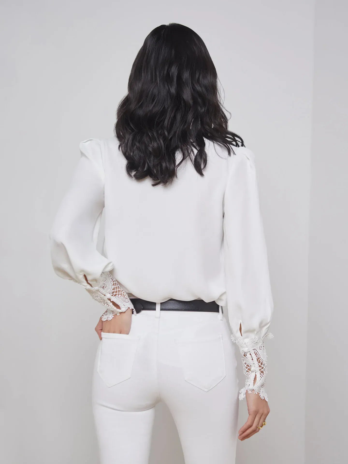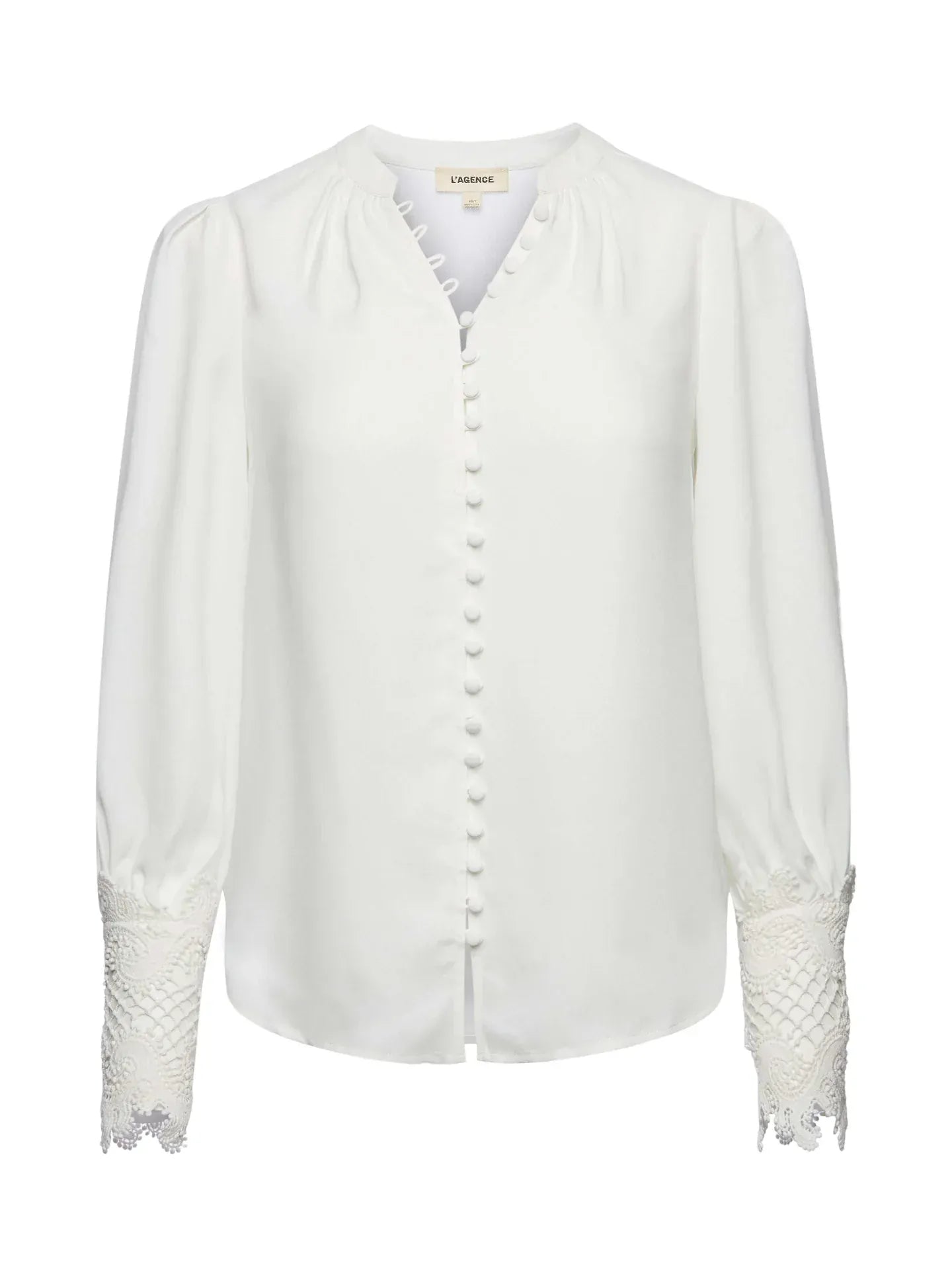 La blouse Ava de L'AGENCE est un chemisier ivoire d'une élégance sublime. Elle présente une fermeture à boutonnière d'inspiration vintage et des poignets allongés en dentelle guipure festonnée raffinée. Portez-la de jour comme de soir.