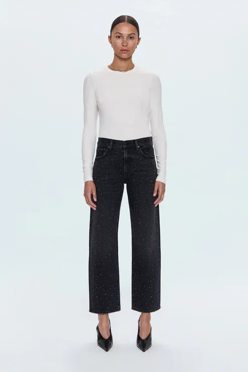 PISTOLA's flagship model, the Lexi Jeans feature a mid-rise waist and a straight leg that curves slightly at the knee for added volume and comfort. The 29" inseam ends in a short, clean ankle. Crafted in rigid denim, its Silver Screen wash, a black adorned with micro-strass, catches the light for an understated sheen.