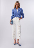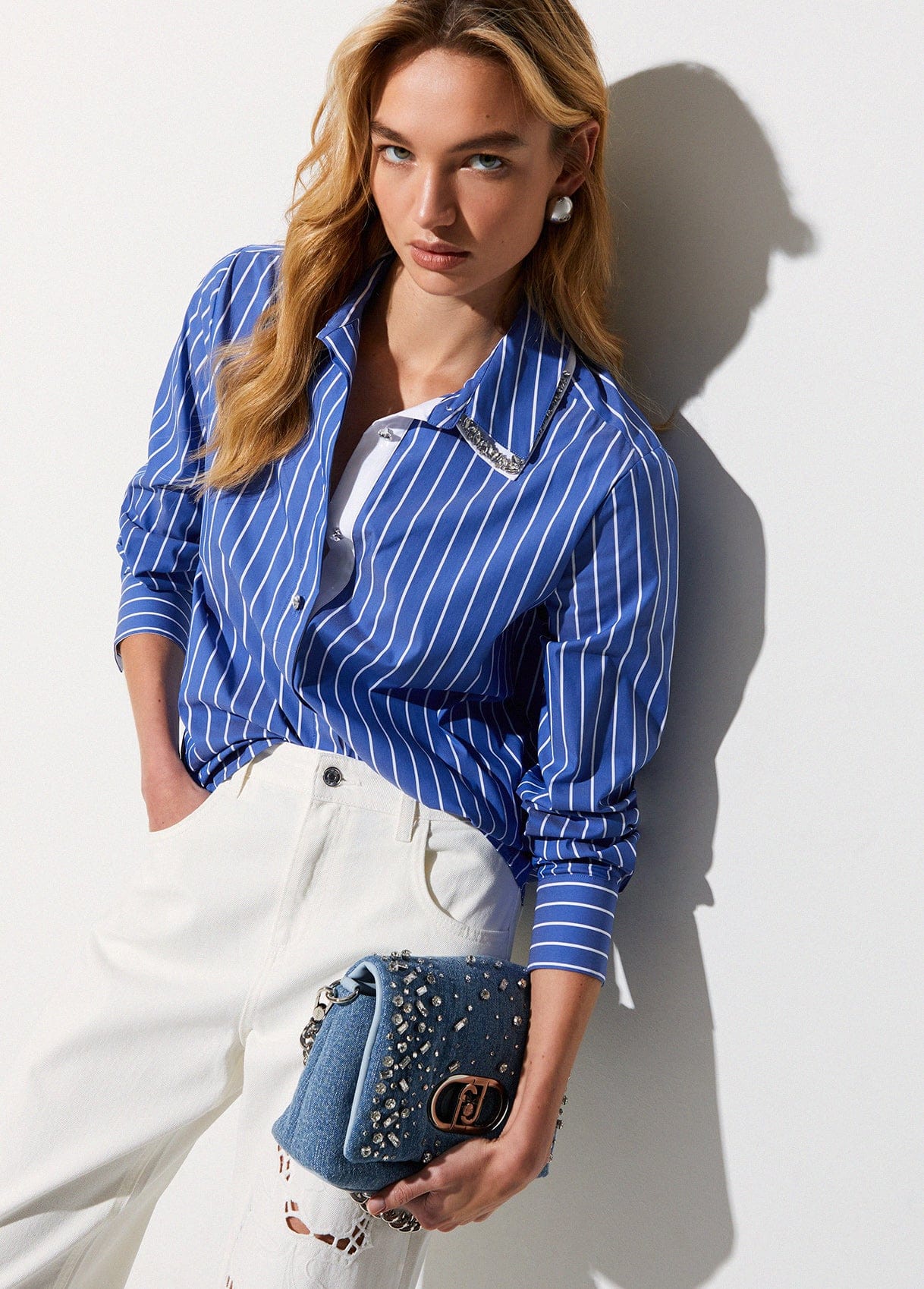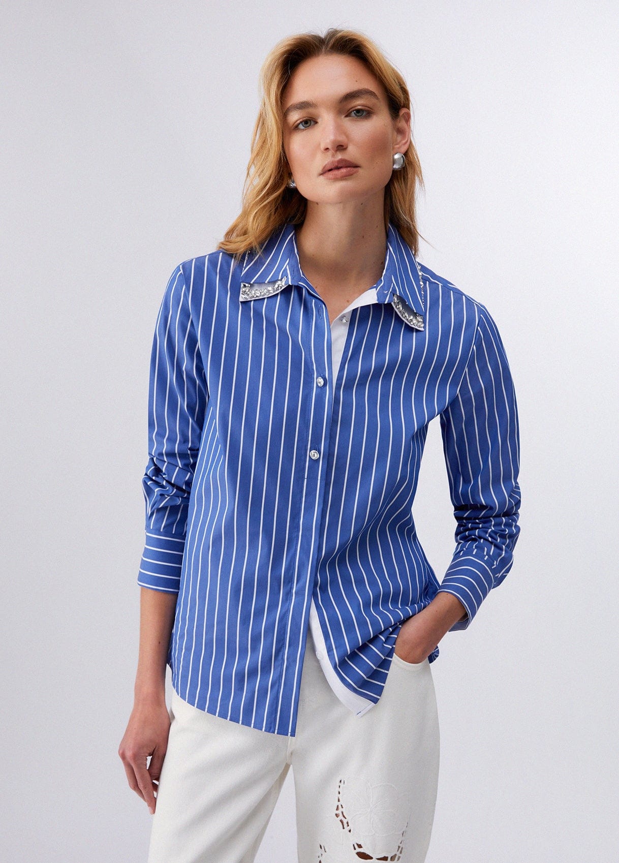 This striped cotton poplin shirt from LIU JO features a detachable collar adorned with jewels for the perfect punch. With its classic cut, pair it with white jeans for a fresh look.