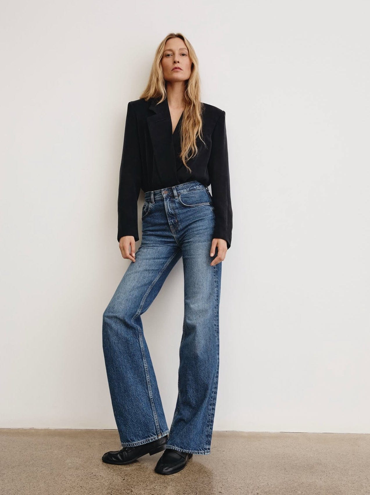 A tucked-in blazer is one of our favorite looks. This bodysuit from SMYTHE, in a timeless draped cupro fabric suitable for all climates, offers a look without volume. With its relaxed silhouette, this new bodysuit blazer features marked shoulders, a wide lapel with exaggerated piping and a thong cut. Wear it dressed up or down with jeans.