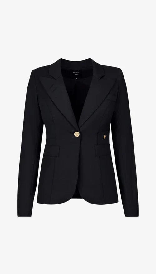 The quintessential Smythe blazer you know and love is updated in a new stretch fabrication with a classic double back slit. Precision-cut from a season-less stretch viscose blend, this slim-fit blazer is designed for year-round wear. The cut-out single-breasted silhouette creates a cinched waist, while the iconic brass buttons make this an undeniably SMYTHE blazer.