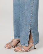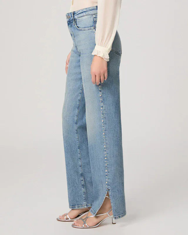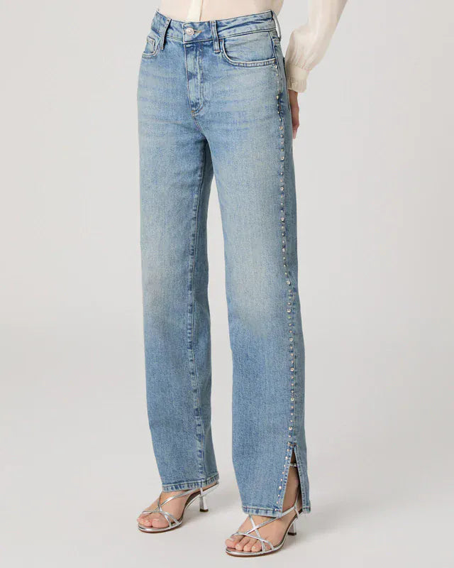 PAIGE's Stevie is a high-waisted straight jean with a 31" inseam length. In a light wash, it is adorned with a studded outer slit. Crafted in vintage-inspired denim, this model is soft to the touch and slightly stretchy.