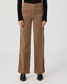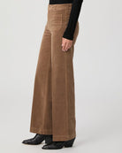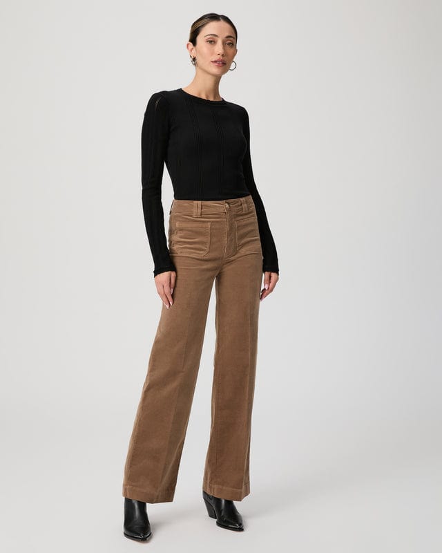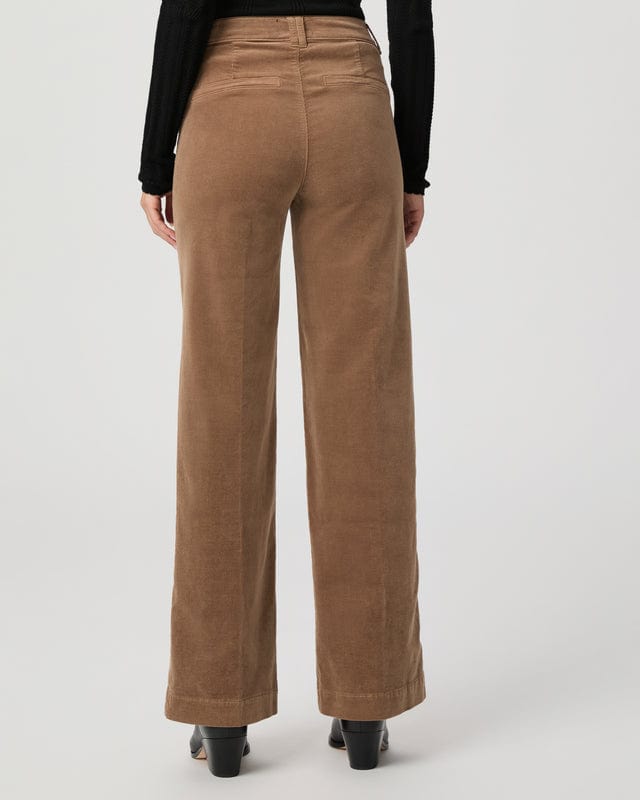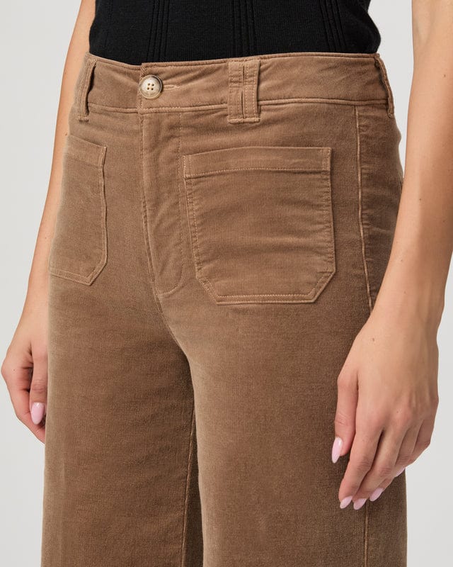 Paige's Sasha denim features a high-waisted wide leg designed with a fitted waist and a slightly relaxed fit. Crafted from luxuriously soft corduroy fabric in a light brown hue, this style features patch pockets. Its 32" inseam pairs perfectly with flats, and is also suitable for petite customers looking to wear it with a heel. This elevated ribbed micro-velvet is made with the perfect amount of stretch for the most comfortable fit from morning to moonlight.