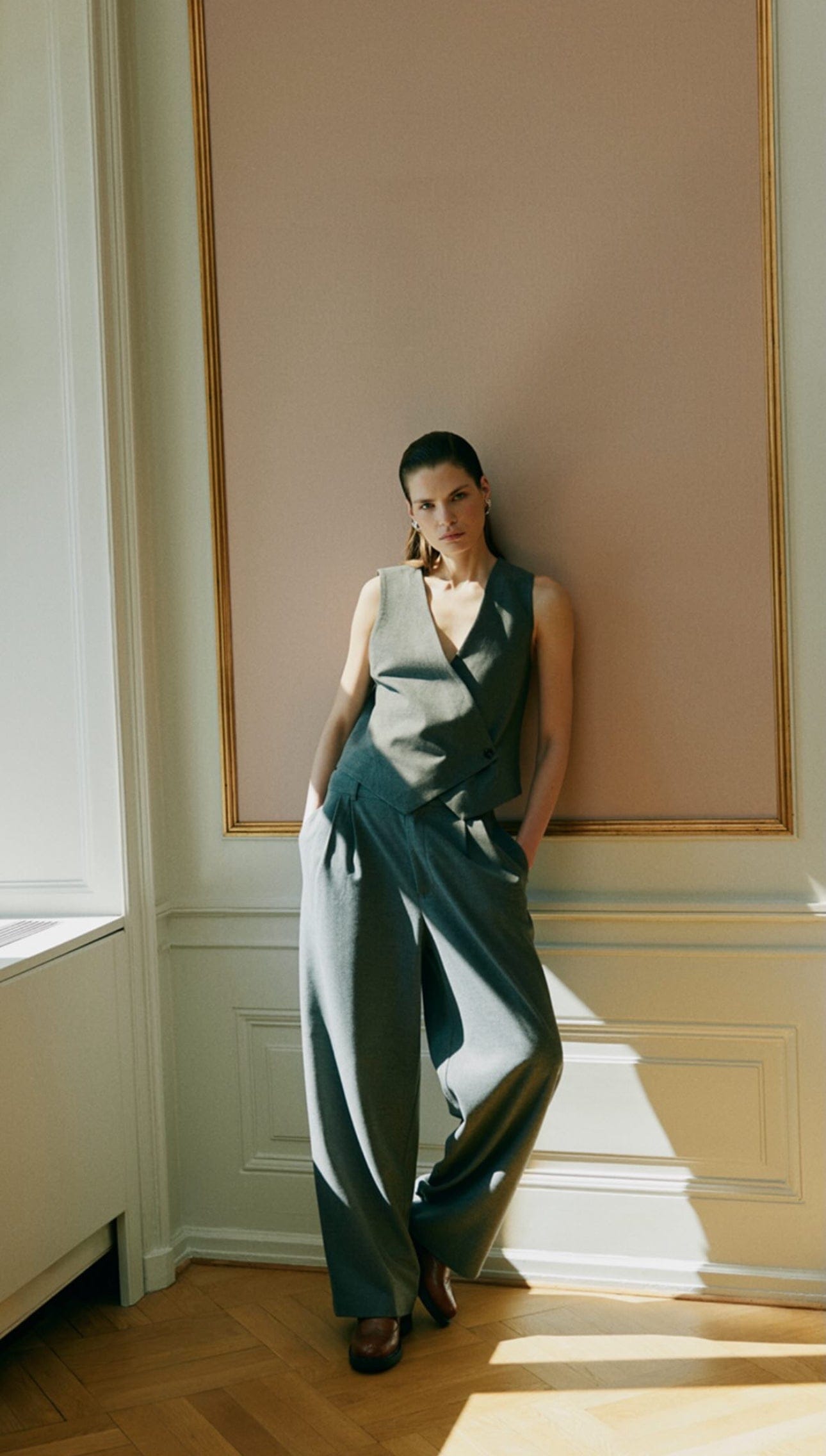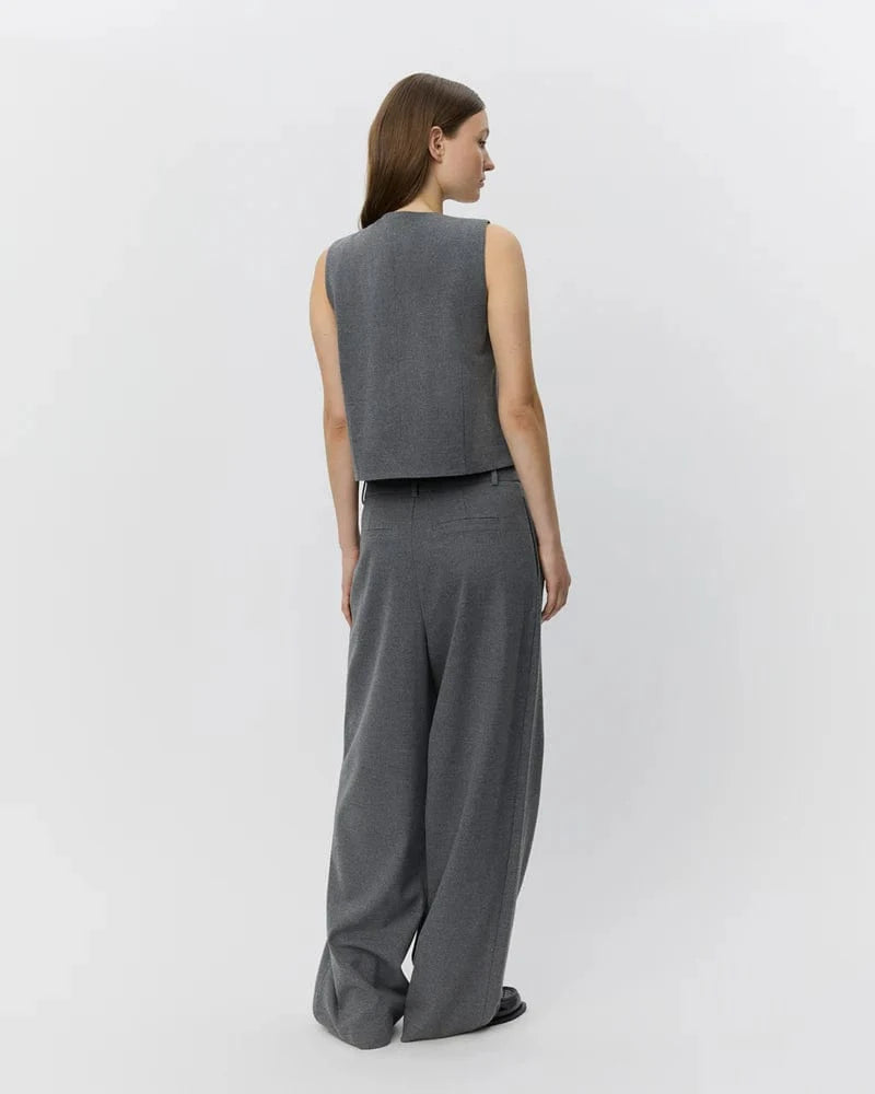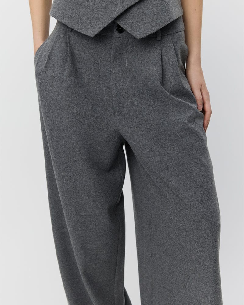 The Rosalindsw trouser pants from SOFIE SCHNOOR are tailored pleated pants. In gray, they feature a high waist and wide legs. Chic, elegant and versatile, they're equally at home in the office or on dressier occasions.