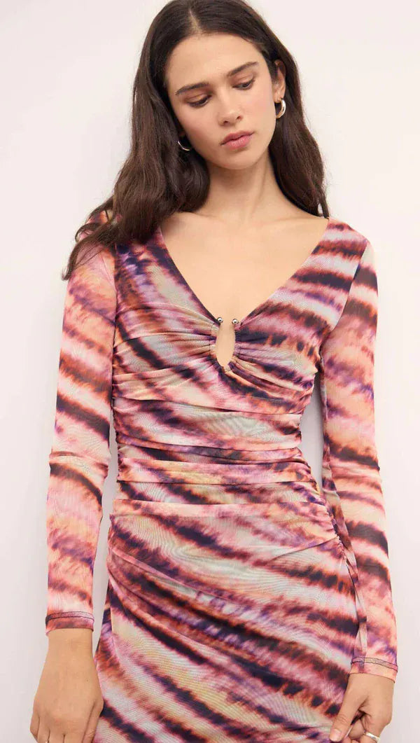 Affirmez votre style avec la robe midi en maille Liv de MINKPINK. Confectionnée dans un imprimé saisissant à rayures abstraites roses et violettes floues, sa coupe près du corps met en valeur la silhouette. Avec son décolleté en V plongeant orné d'une découpe en forme de goutte froncée, ses longues manches et ses fronces latérales flatteuses, cette pièce audacieuse est idéale du matin au soir. Portez-la aussi bien avec des bottes qu'avec des talons.