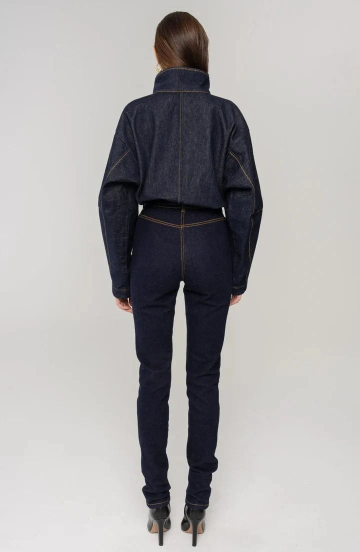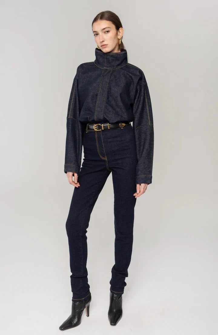 A fitted piece with neat finishes and striking edges, the Britta bodysuit from RONNY KOBO is designed to sublimate a denim outfit. Crafted in dark denim with subtle sculptural seams, it features a stand-up collar and relaxed fit. Wear it with the Izabel skirt for a totally fashionable outfit.