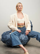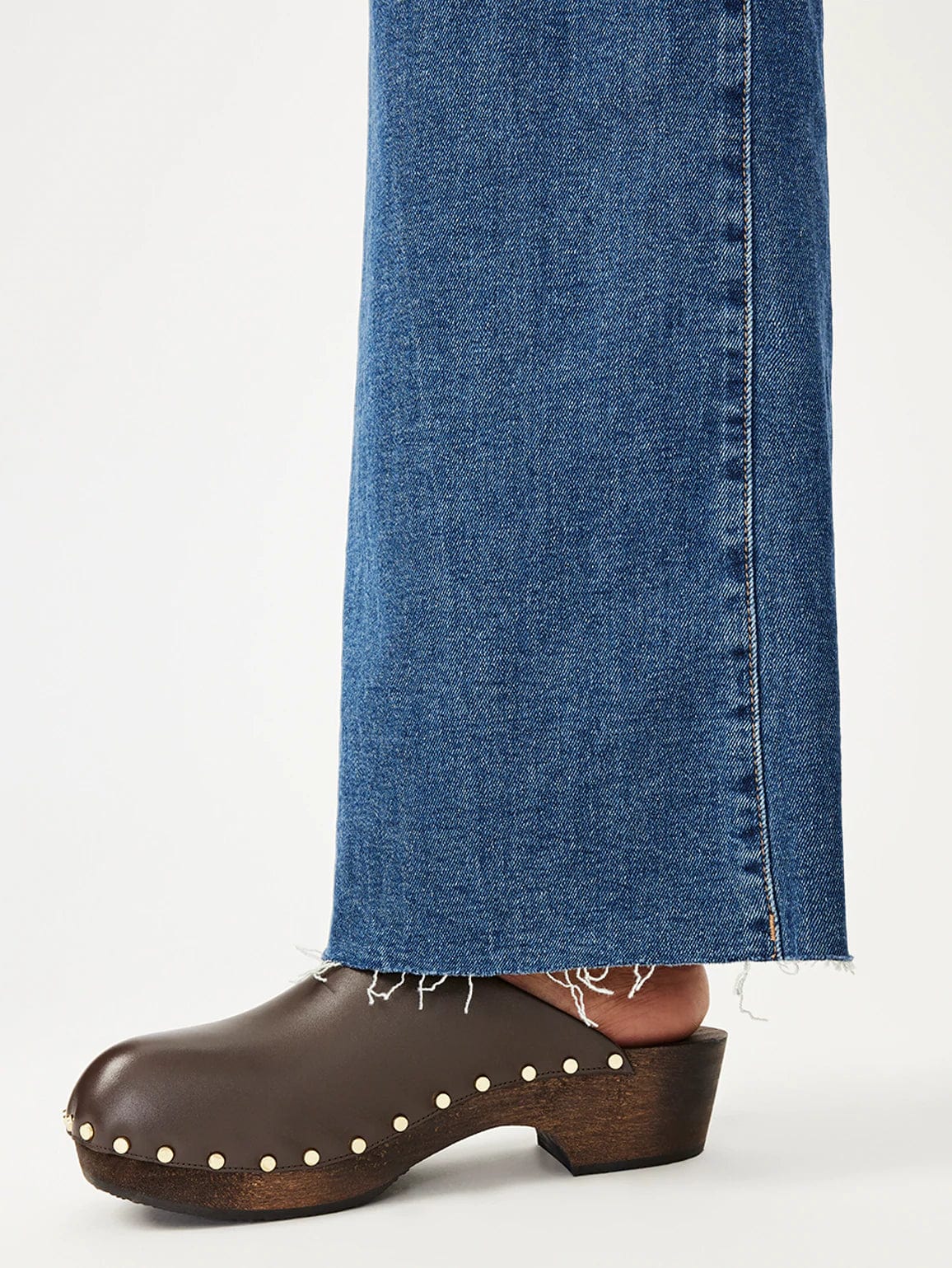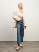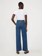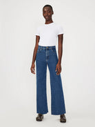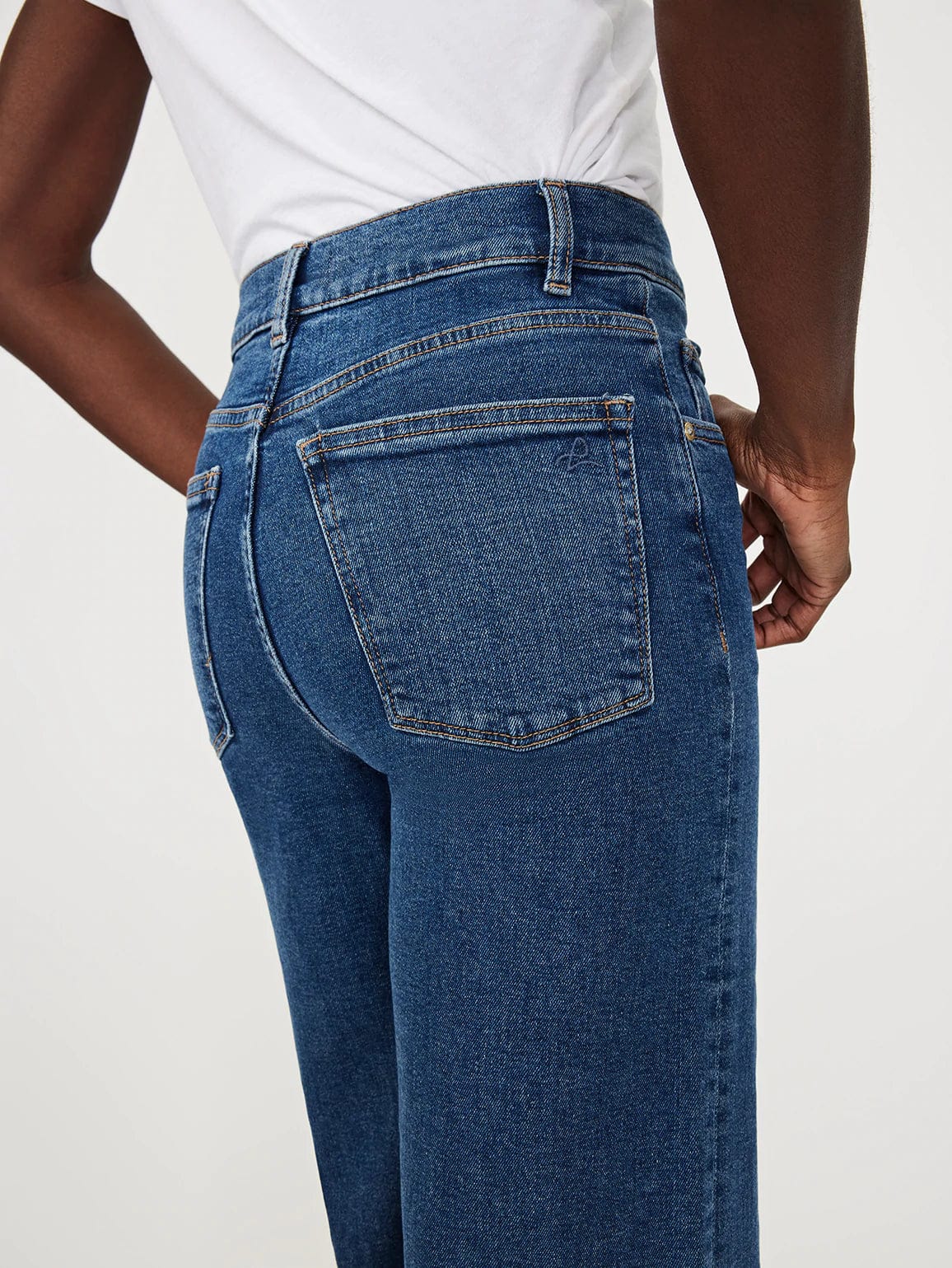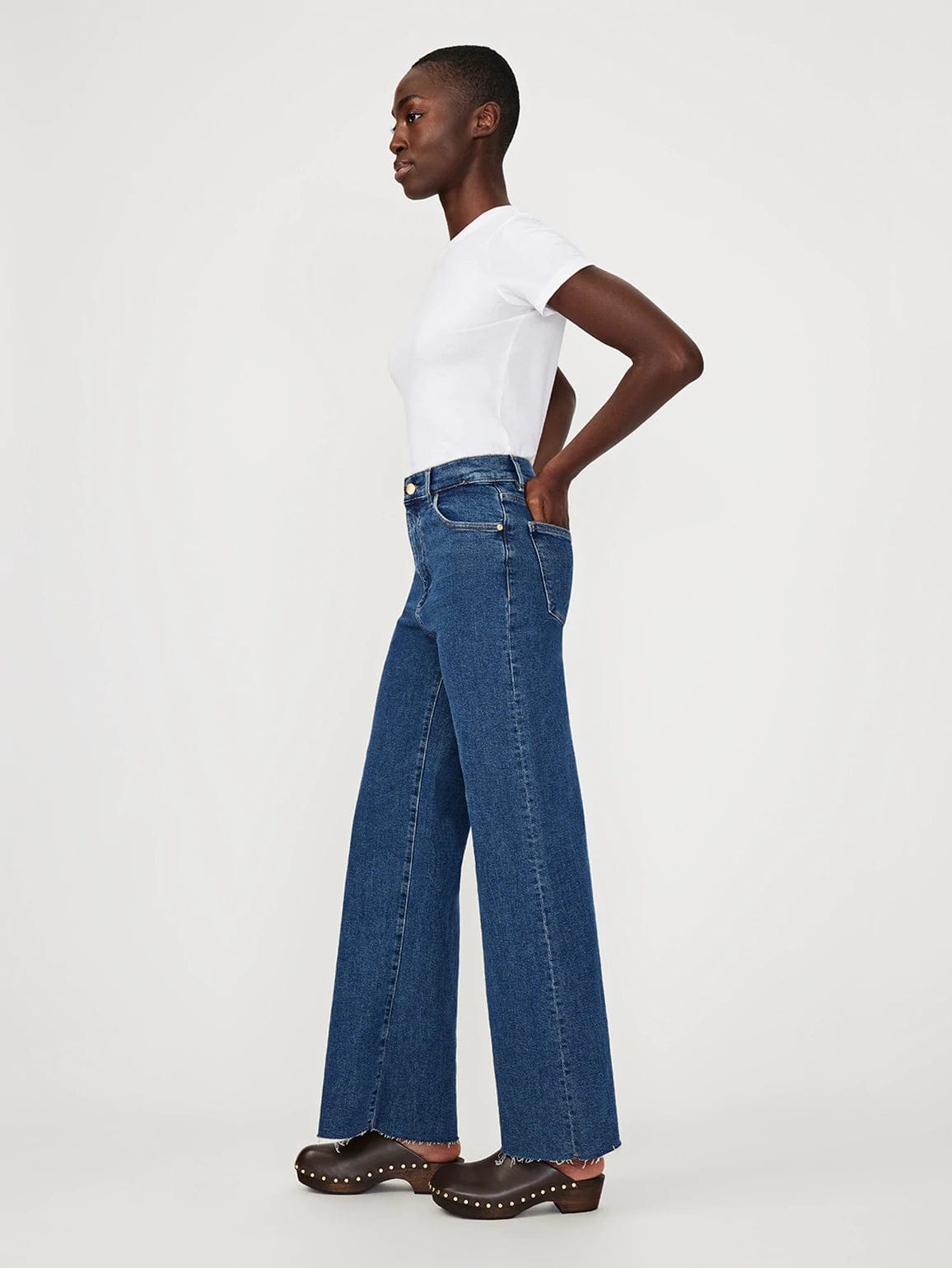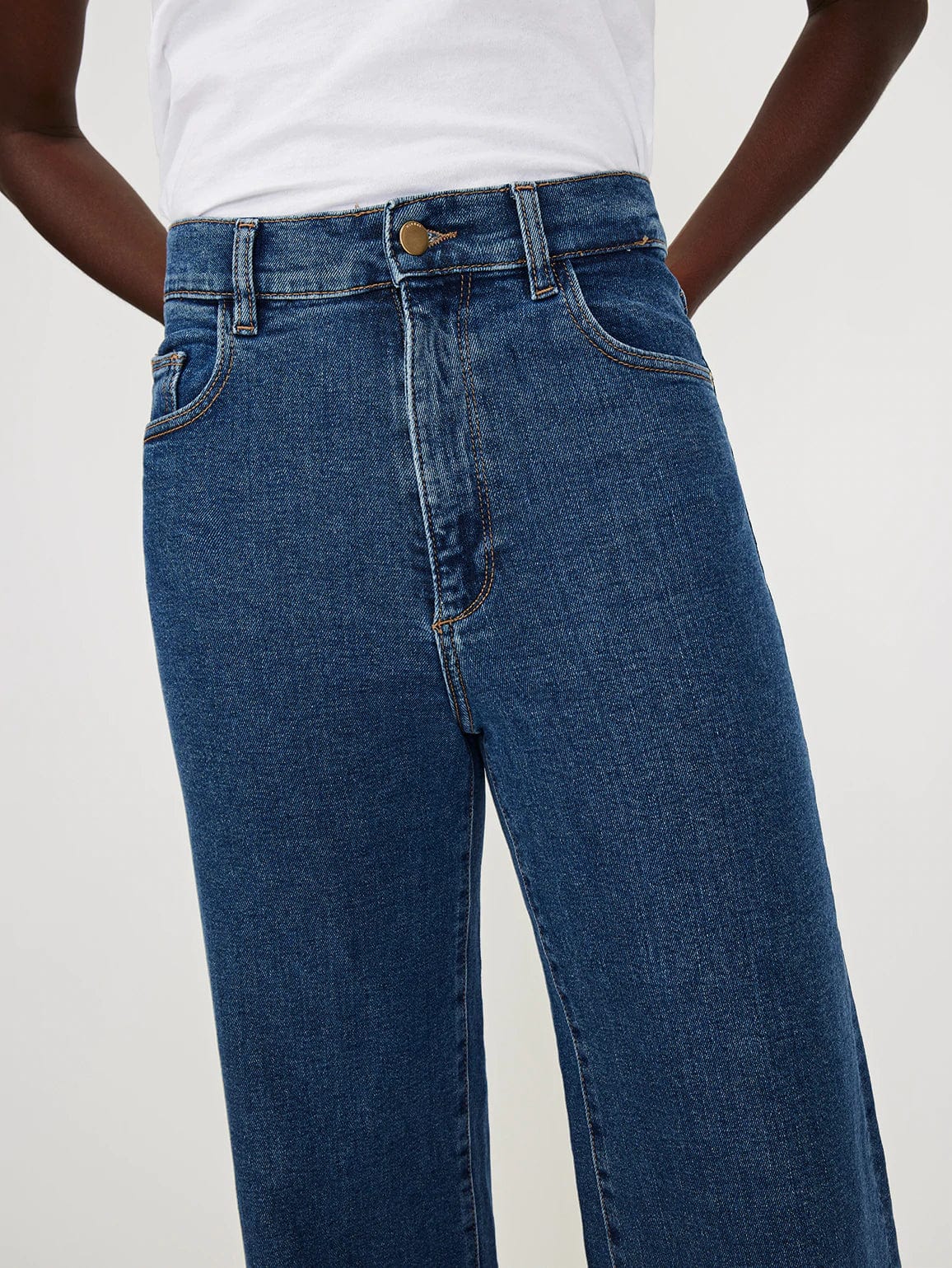 Hepburn est une taille haute vintage ajustée à la taille et à l'assise, se rétrécissant vers l'extérieur à partir de la cuisse pour une jambe large avec un entrejambe de 31 pouces. D'un délavage indigo brillant et bavard, il présente des finitions dorées brossées, des surpiqûres kaki et un ourlet brut.
