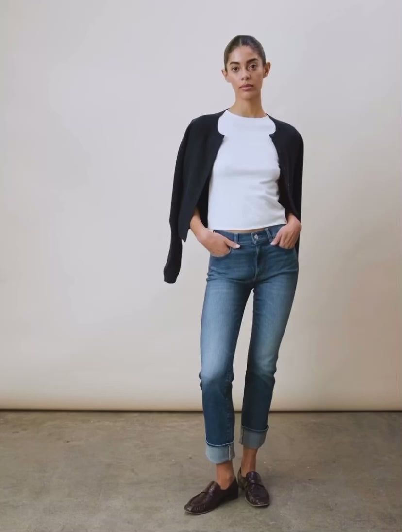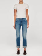 Le Mara Straight de DL1961 possède une coupe droite, une taille mi-haute et une longueur cheville qui utilise la technologie Instasculpt pour lisser, sculpter et s'adapter à votre corps pour un ajustement parfait. Sa couleur Hulton Cuffed est un délavage indigo moyen avec une subtile décoloration et des moustaches pour un look usé. Le jean présente une tige argentée brillante, des rivets en cuivre mat, des coutures multicolores, un ourlet à revers fonctionnel et un patch marron au dos.
